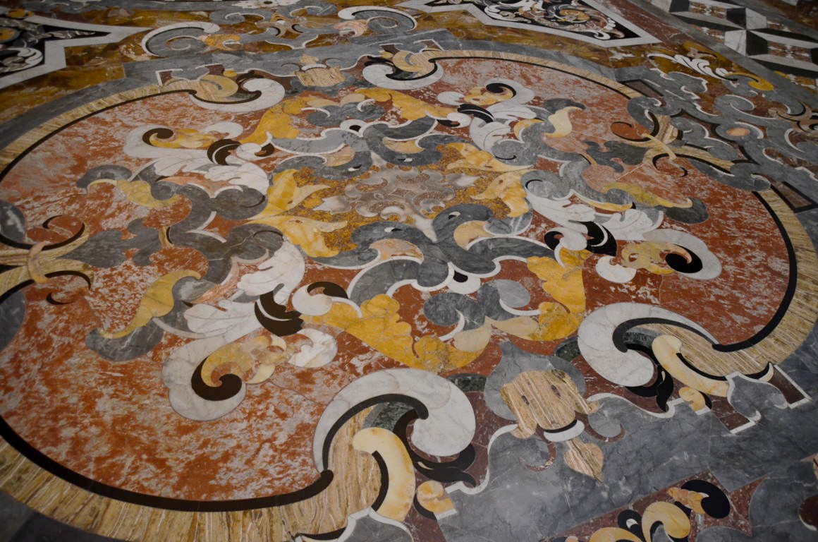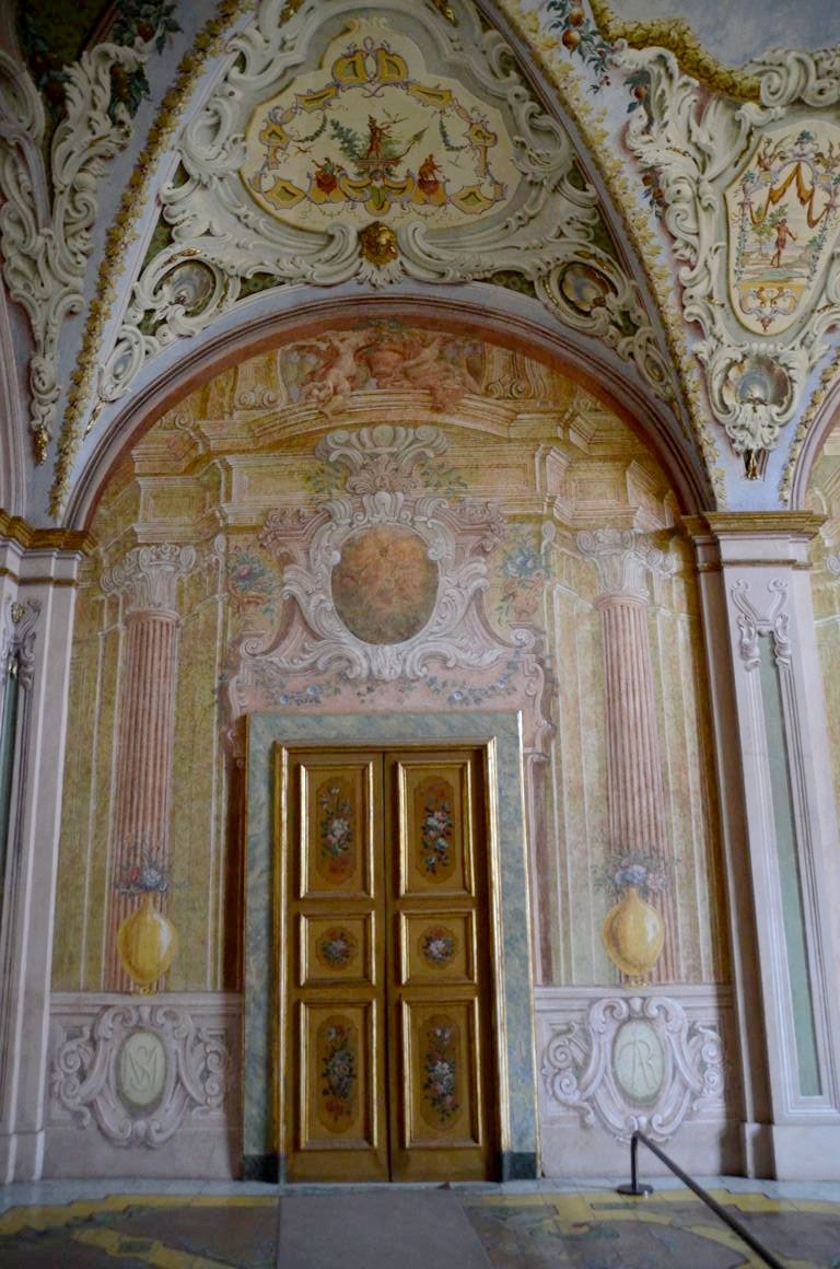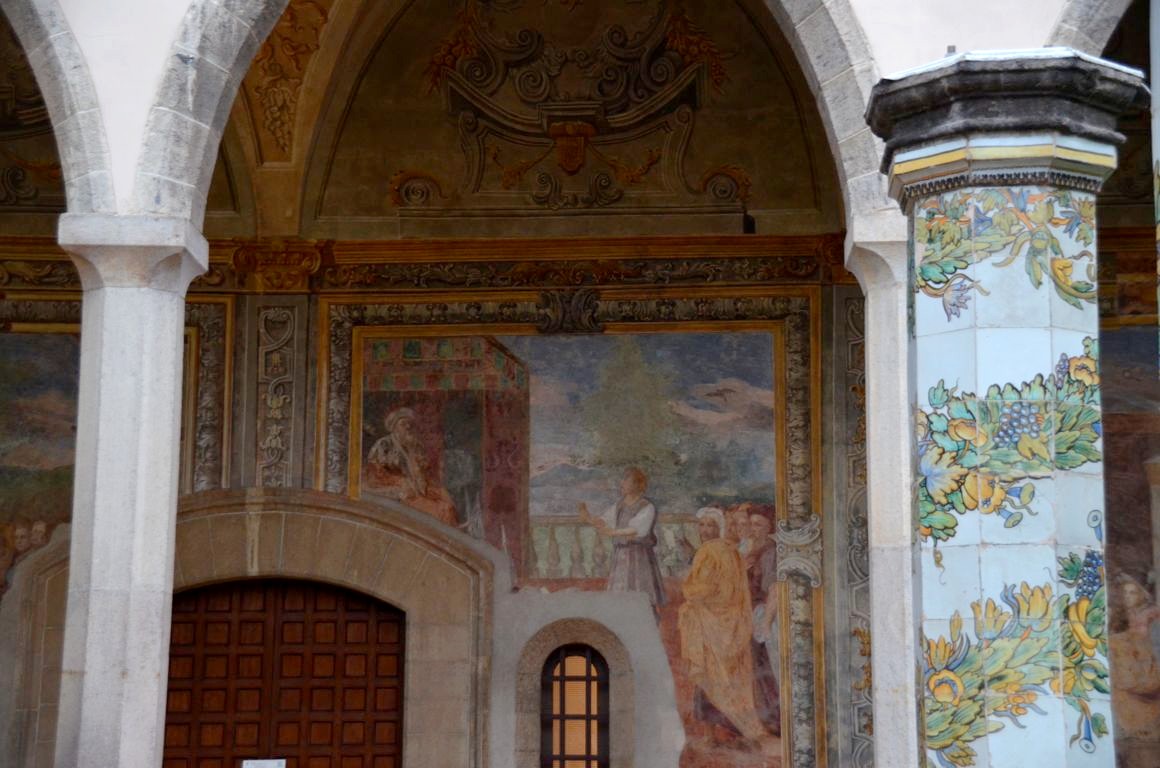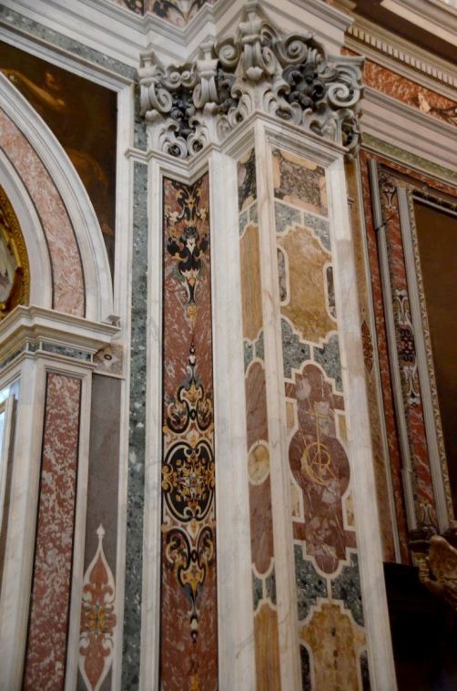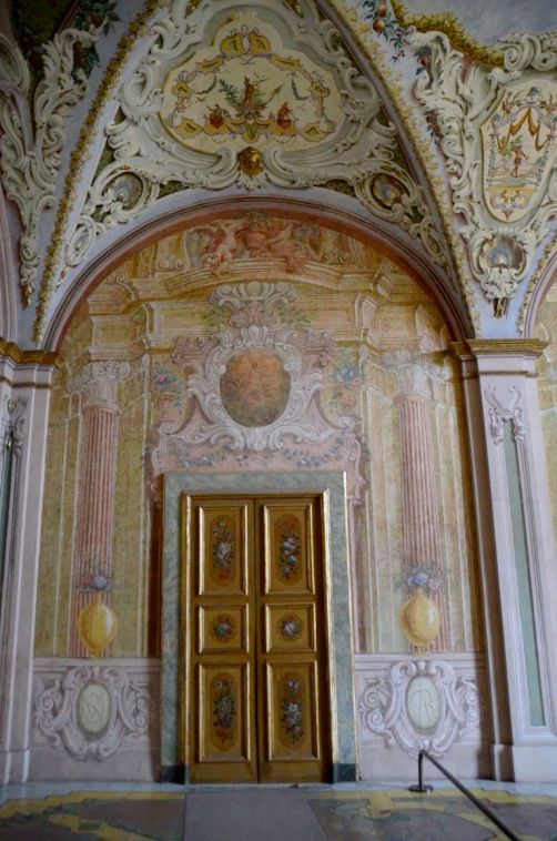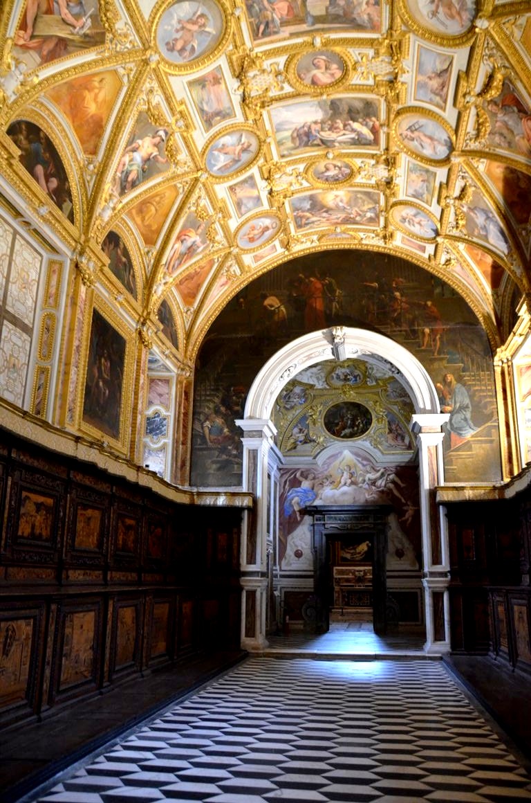 De la cour d’honneur plutôt sobre, nous entrons dans l’église richement décorées, avec de magnifiques dorures et surtout des fresques faites de plusieurs couleurs de marbres, au sol mais également sur les murs. Quel travail impressionnant !