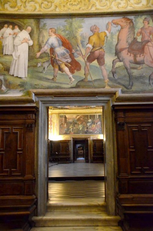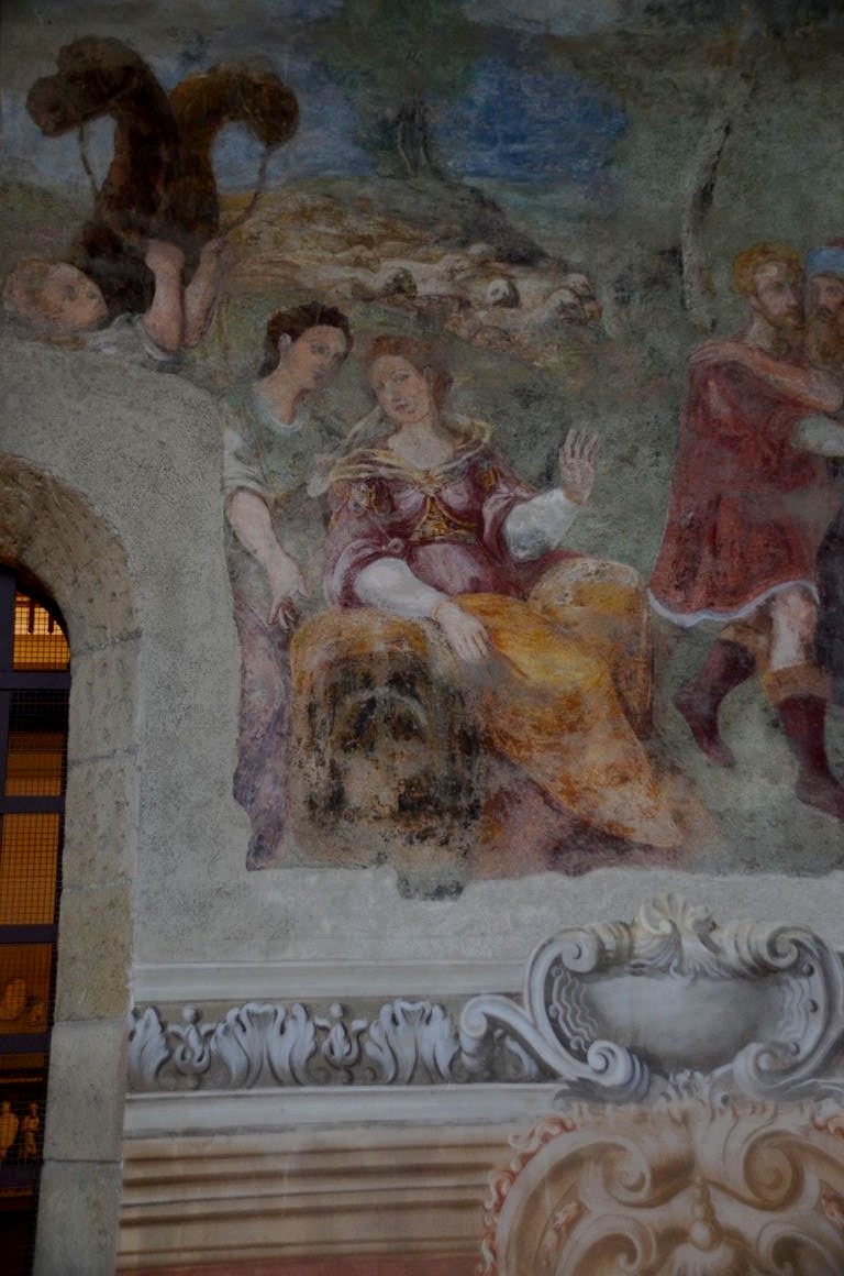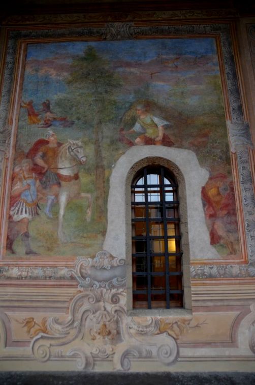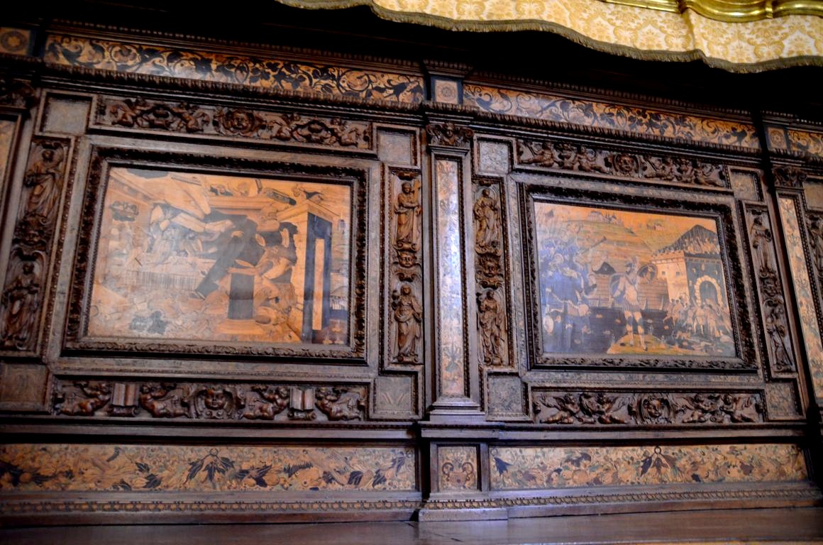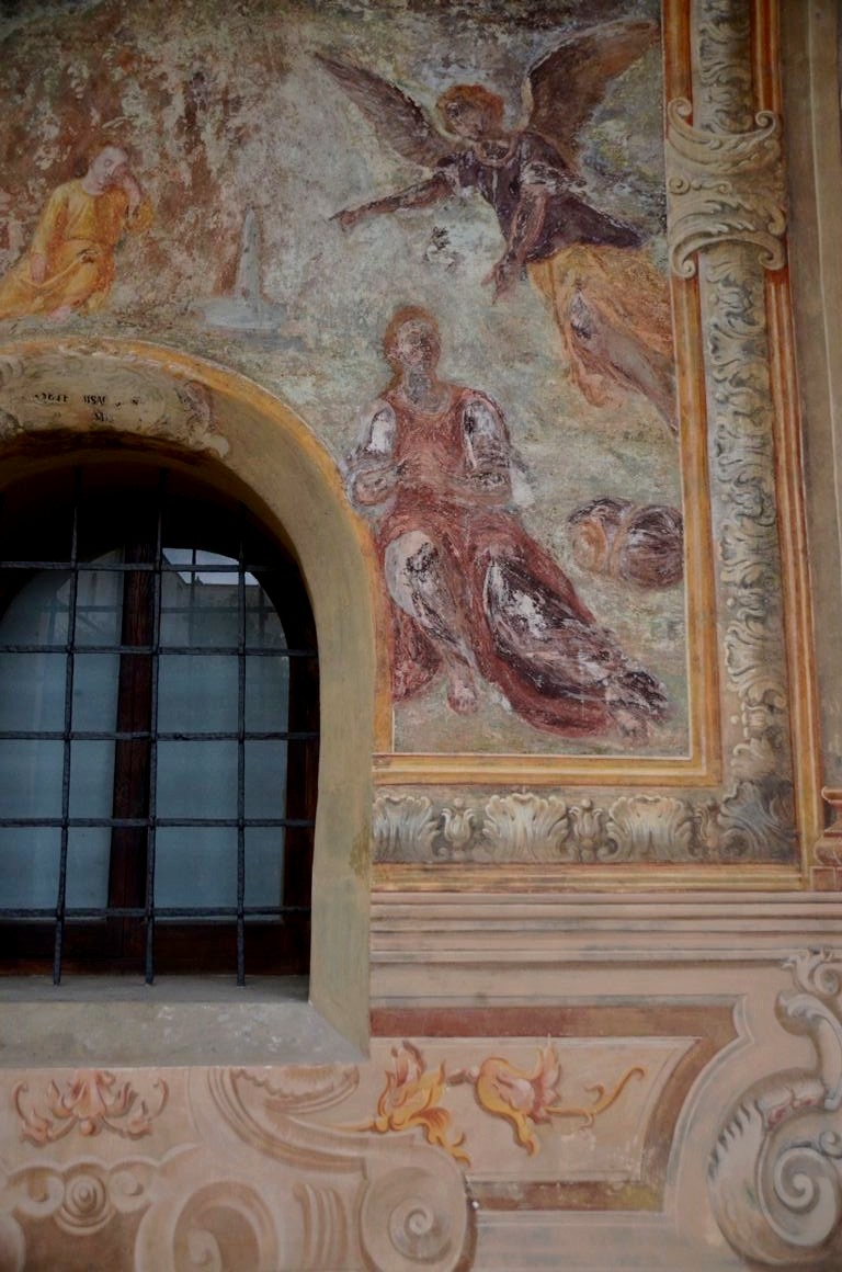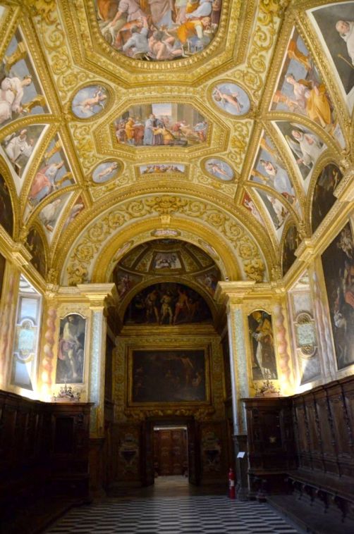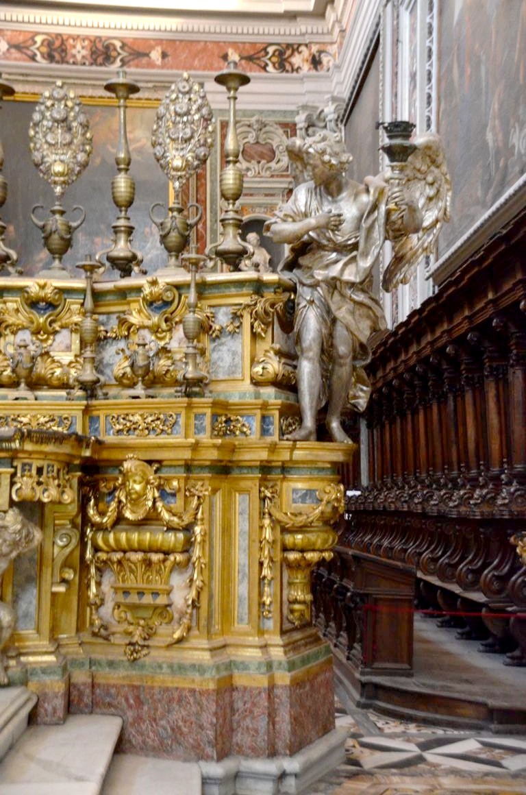 De la cour d’honneur plutôt sobre, nous entrons dans l’église richement décorées, avec de magnifiques dorures et surtout des fresques faites de plusieurs couleurs de marbres, au sol mais également sur les murs. Quel travail impressionnant !