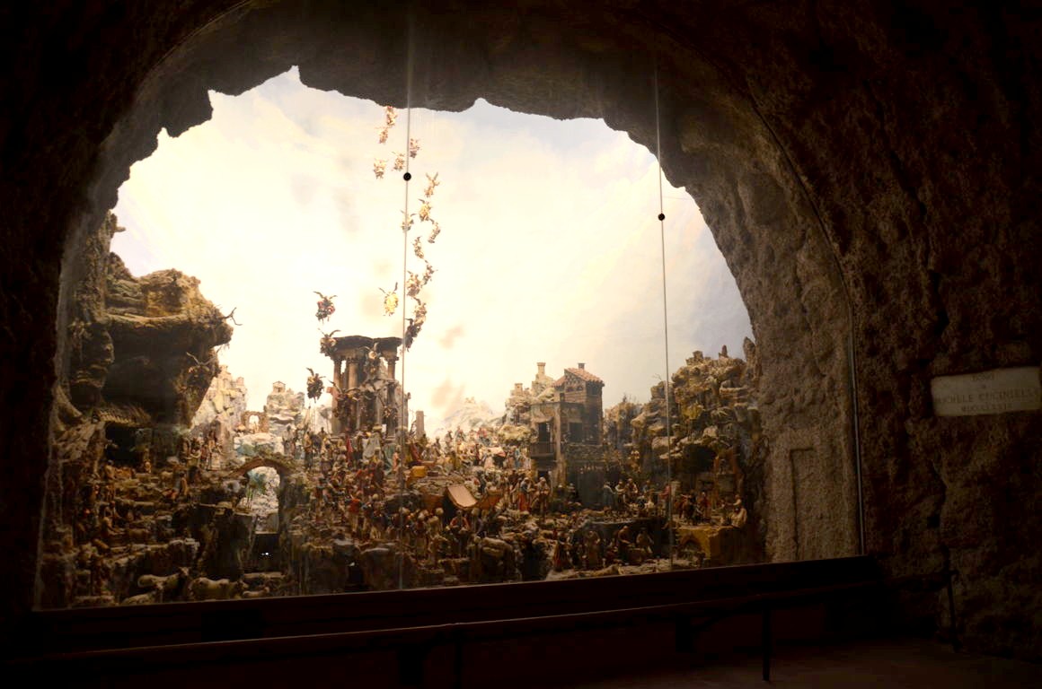 Des expositions diverses occupent une grande partie de l’ancien monastère: carrosses, santons, navires, et – bien sur – une des plus belles crèches de Naples. Nous passons également par les terrasses du monastère, d’où nous essayons d’apercevoir Capri, au large de la Baie de Naples.