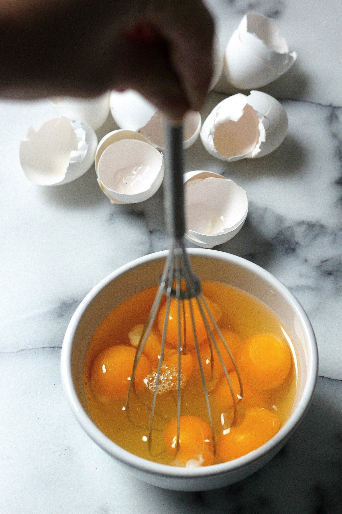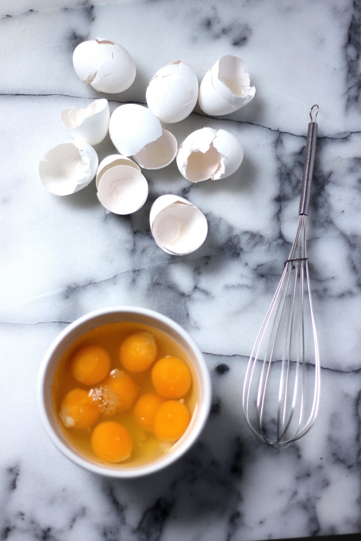 Add remaining oil to a medium-sized non-stick skillet over medium-low heat. While the oil is heating up, re-whisk your eggs; stirring like crazy! You really want them beat well.