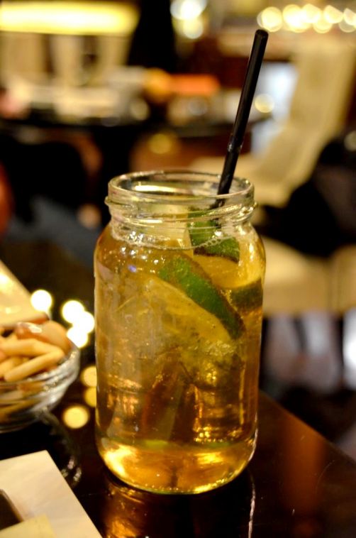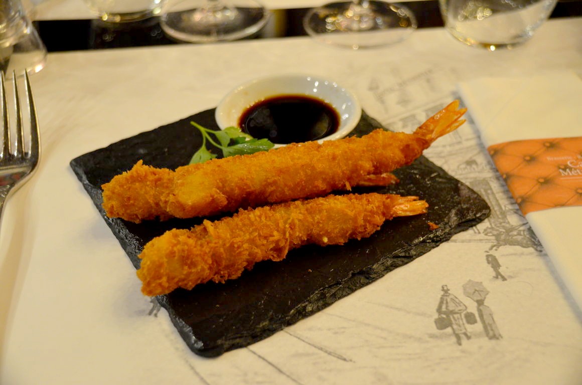 Nous commençons le repas par un apéro, accompagné d’une petite tapas (crevettes panko). Pendant que je fais découvrir l’apéro bruxellois par excellence, le half and half (moitié vin blanc et moitié mousseux), je teste pour ma part un cocktail original, le Einstein Bulleit (à base de whisky Bulleit, Thomas Henry et Angostura) : délicieux !