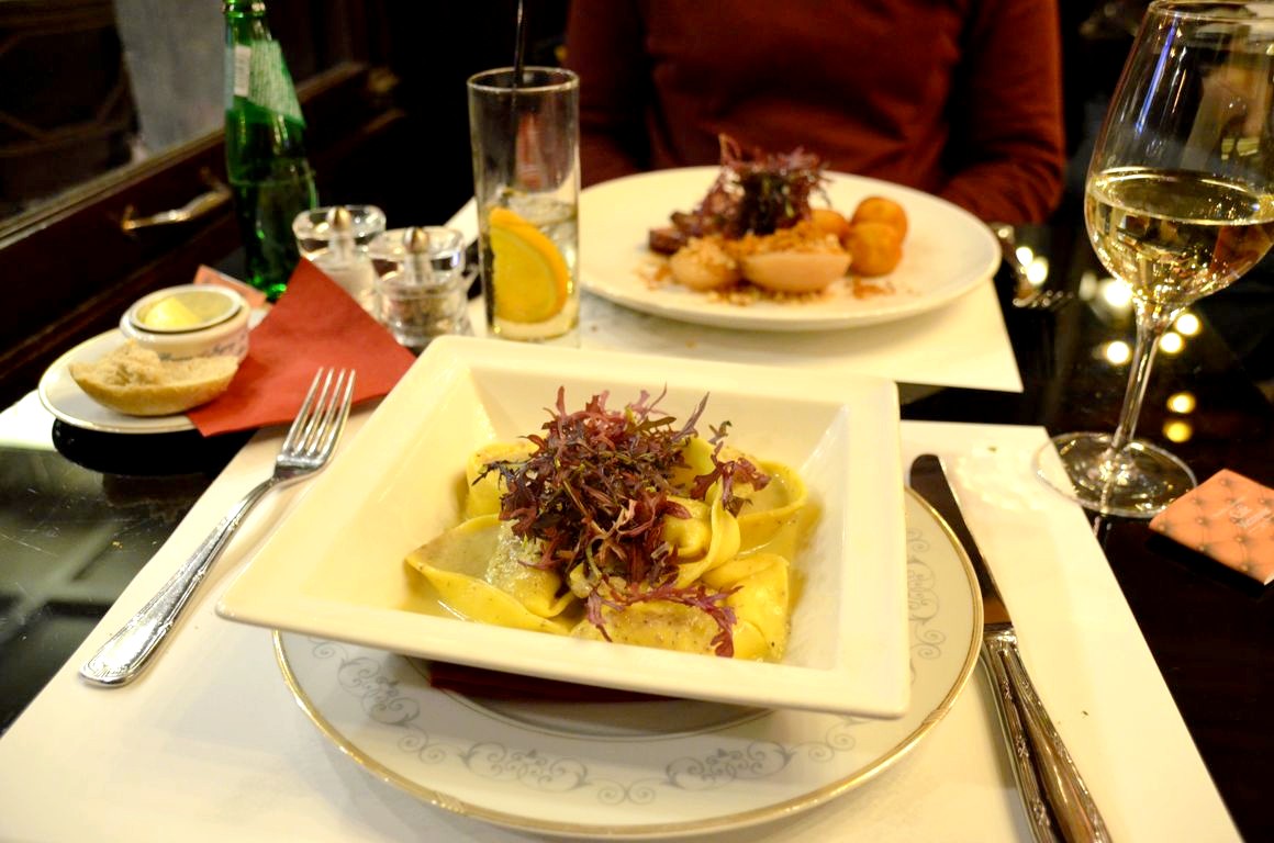 En plat, nous continuons avec deux plats phare du restaurant, le magret de canard aux noisettes et spéculoos, poire nashi pochée au vin blanc et croquettes de potiron, et pour moi les Tortellinis aux cèpes, crème de champignons, lard de Colonnata et parmesan, ben cuits et goûteux même si j’aurais bien aimé un peu plus de morceaux de champignons (mais c’était quand même très bon également).