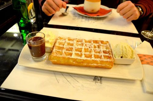 Enfin, en dessert, je craque pour une gaufre de Bruxelles (Mikado) dont j’avais envie depuis des semaines, pendant que Monsieur opte pour le Tiramisu bruxellois au spéculoos, dont il ne laissa pas une miette.