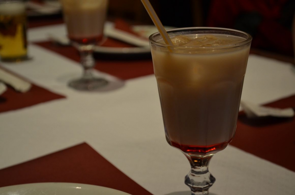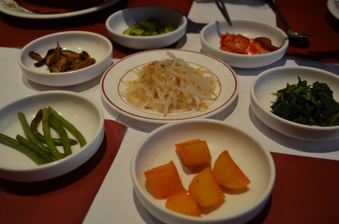 Comme « mise en bouche », nous recevons un Banchan, qui est à la base un plat d’accompagnement, et qui consiste en différent petits plats de légumes, principalement. Parmi les petits plats, on retrouve le kimchi (chou fermenté), des épinards au sésame, du soja, des champignons, des pommes de terre sautées, des haricots verts et des courgettes. Pour accompagner tout cela, nous prenons également un apéritif maison, le kitschissime « Love Séoul » à base de vin de riz coréen… assez surprenant (rien à voir avec le vin de riz que nous avions, par exemple, goûté à Bali). Attention par contre, sur le coup ça se boit tout seul, mais c’est assez traître !