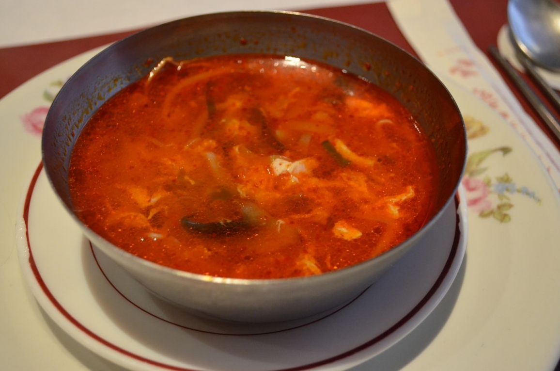 On nous apporte ensuite une soupe piquante à la viande et aux légumes: rien à voir avec la mélasse servis dans la plupart des restos chinois (même s’il faut avouer que j’adore ça aussi…), ici c’est une sorte de bouillon très pimenté aux légumes croquants et avec quelques petits morceaux de viande de boeuf.