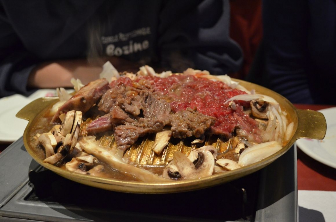C’est en fait la seule différence car la cuisson est la même pour les deux types de viande: la viande de boeuf, préalablement marinée, grille sur le milieu du grill, alors que les accompagnements (ici oignons et champignons) mijotent tranquillement dans le bouillon archi-savoureux. Bref, je vous conseille de prendre moitié-moitié pour pouvoir goûter aux deux sortes de viande, qui sont toutes les deux ultra tendres.