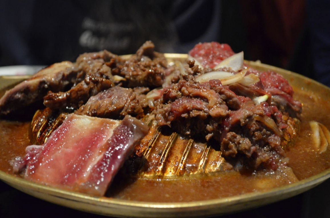 Nous passons ensuite au barbecue tant attendu, le bulgogi (ce qui veut dire littéralement « viande de feu » en coréen). Il existe en fait, sur la carte, deux types de « barbecue »: il y a la « fondue » coréenne, avec de la viande coupée en petits morceaux, et le barbecue à l’os, avec de la viande encore sur l’os.