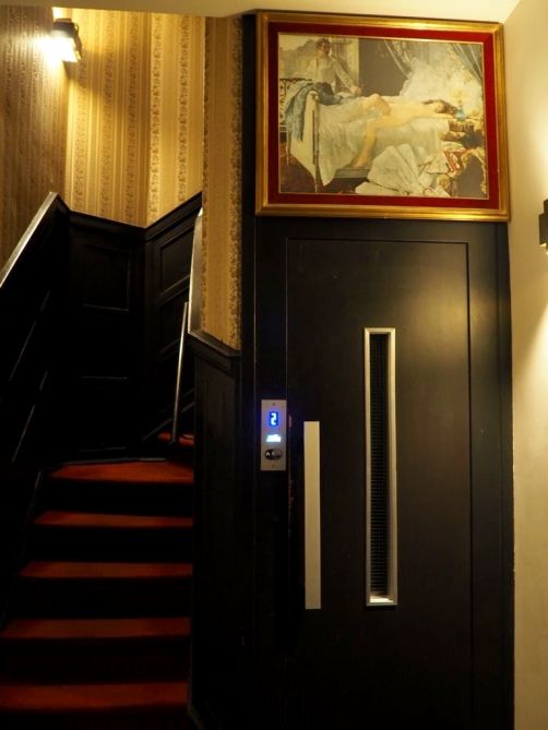 Vous remarquerez aussi que les deux ascenseurs de l’hôtel ne sont pas côte à côté : c’est parce qu’ils permettaient à l’origine aux clients discrets de l’hôtel de ne pas se croiser… !