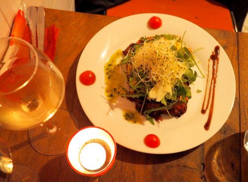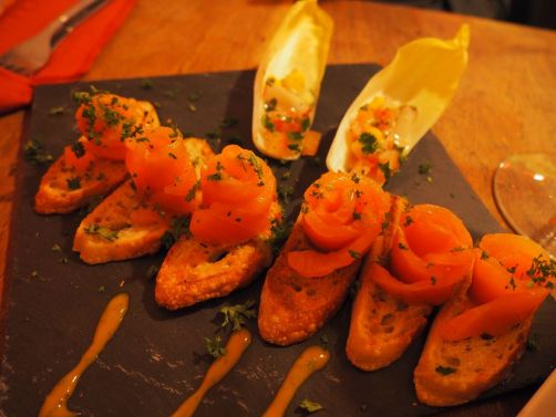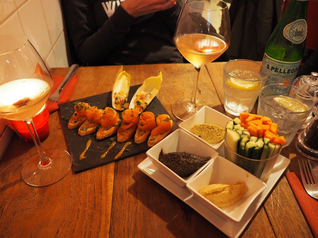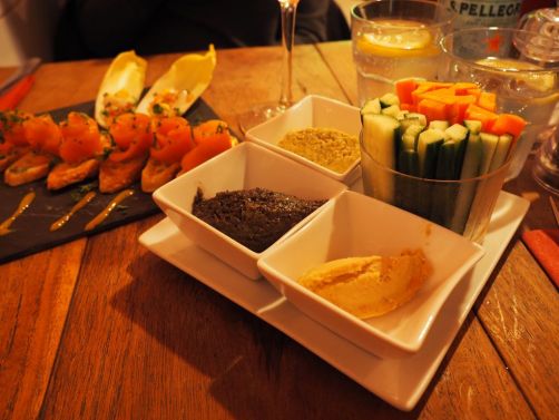 Nous avons commencé par un petit apéro avec un verre de vin et quelques tapas : le sashimi de saumon façon gravelax, présenté sur des petits toasts (6,90€) et les dips de légumes (tapenade d’olive verte, tapenade d’olive noire et houmous – 7,80€ et trop bon !).