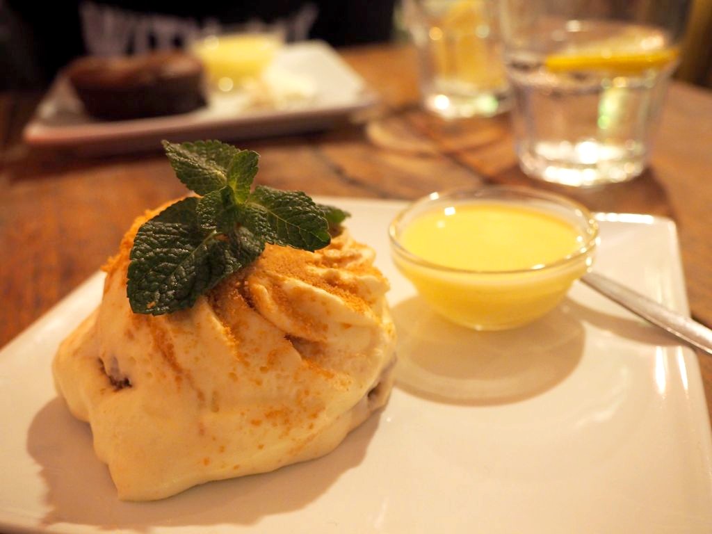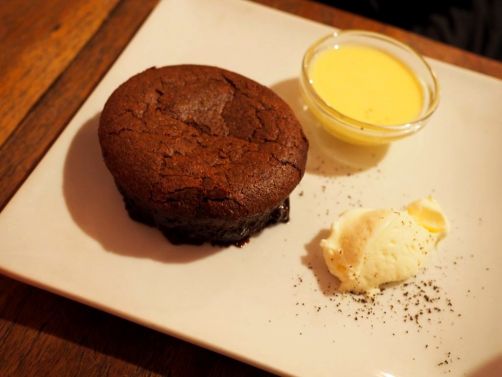 En dessert, on a finalement craqué pour le tiramisu au spéculoos (5,90€ – fait maison et top !) et le mi-cuit au chocolat et crème anglaise (5,50€).
