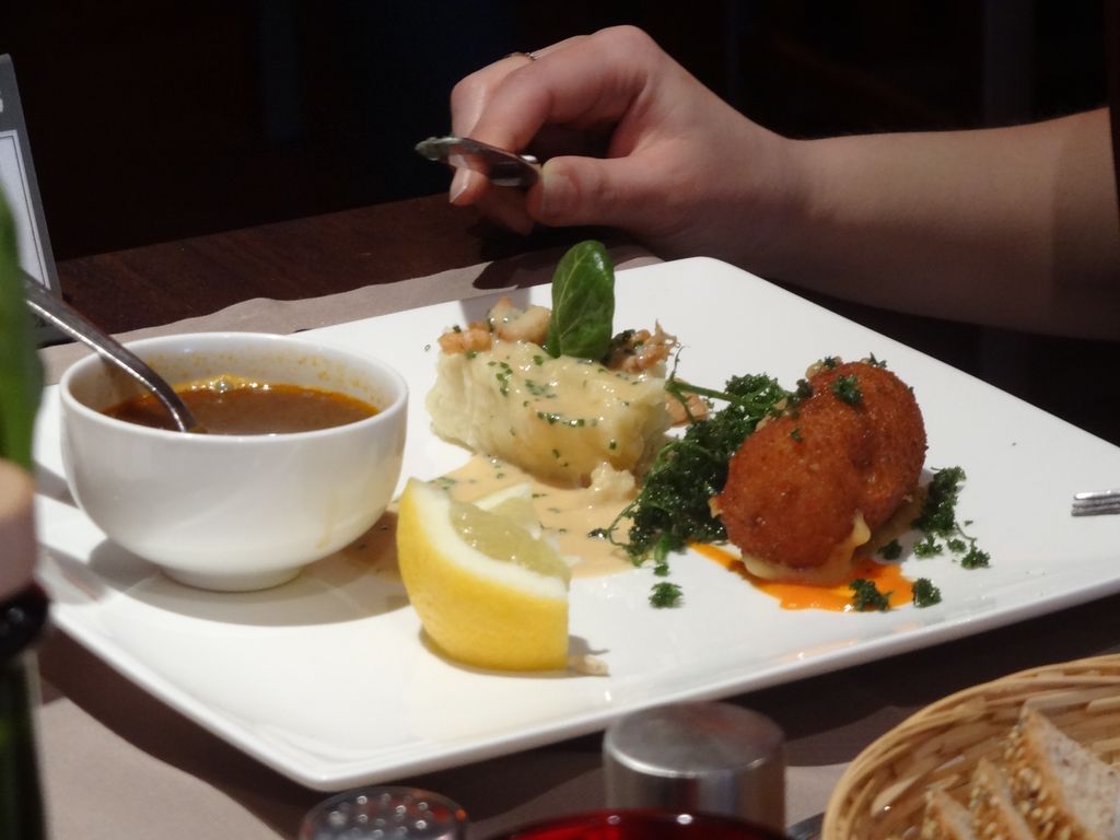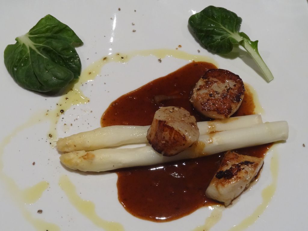 On commence fort avec de magnifiques coquilles St Jacques poêllées au sésame, aux asperges vertes et jus de veau, tandis que d’autres penchent plutôt pour les tapas à l’Ostendaise, qui revisite les spécialités de la mer – croquette au crevette, petite Bisque et pommes Polder aux crevettes grises d’Ostende qui, ma foi, avait l’air un très bon choix également.