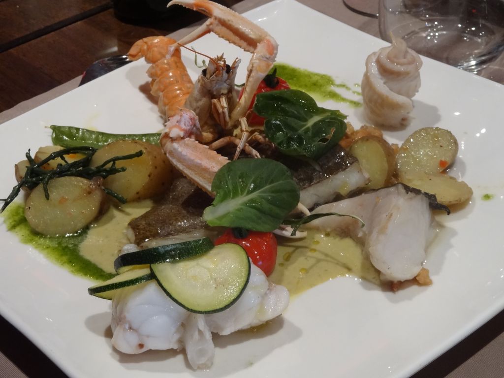 Je découvre dans d’autres assiettes la « dégustation de la mer du Nord », un peu plus classique, avec du turbot, de la sole, de la lotte, de la langoustine, accompagnés de pommes vapeur et de petits légumes.