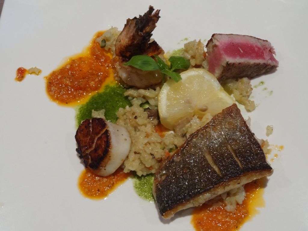 Comme plat, alors là nous montons au 7ème ciel avec le quattro a la plancha, le quattro était du bar de ligne, des St. Jacques, des Gambas, et du thon rouge, le tout accompagné de deux pestos (basilic et tomates) et d’un risotto aux champignons. Les cuissons sont parfaites et l’association du tout est un régal, tout simplement.