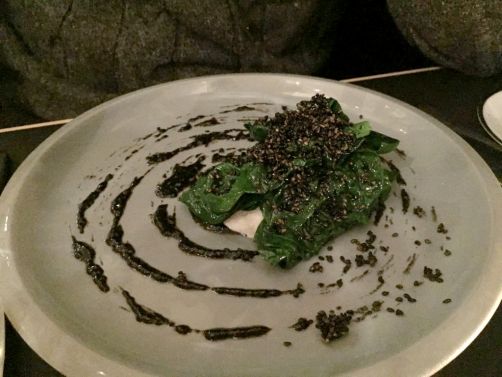 Nous avons ensuite dégusté l’un des plats signature du chef, une surprenante préparation à base d’épinard, de ricotta et de sésame noir. Un régal !