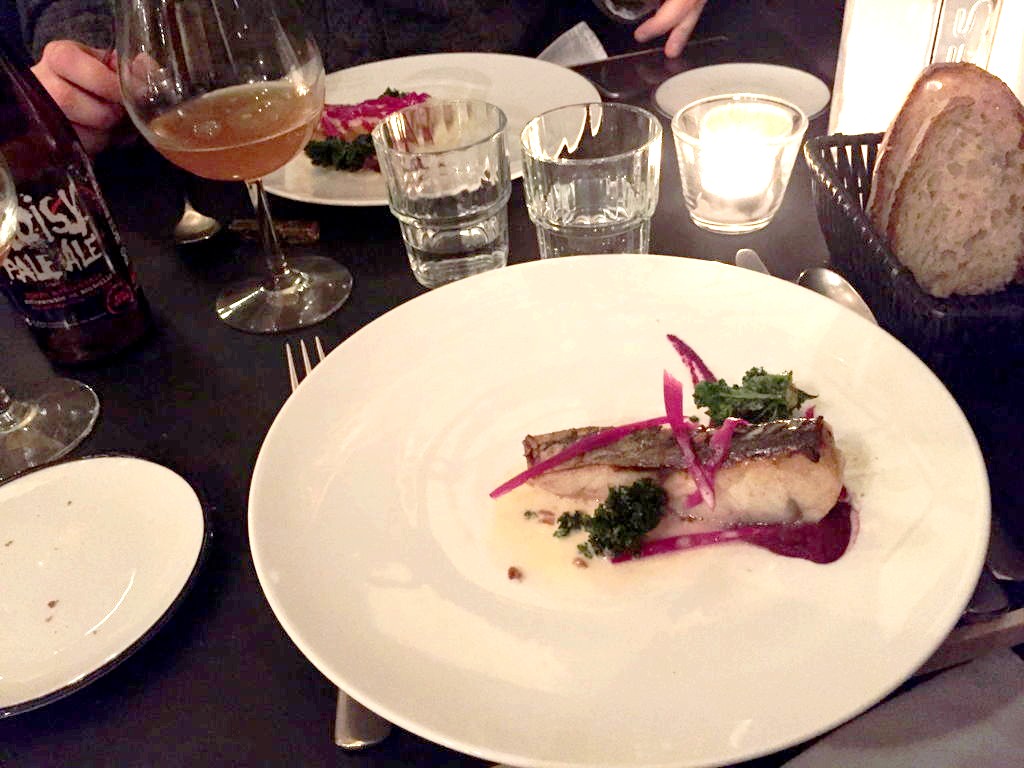 Nous avons commencé le repas par une entrée à base de chou rave, maquereau et kumquat, suivie d’un autre petit plat au topinambour, foin et cacao. Une belle introduction en la matière. Comme vous le verrez, l’une des particularités de la cuisine de Nicolas Scheidt à La Buvette est de proposer des accords originaux, voire surprenants.