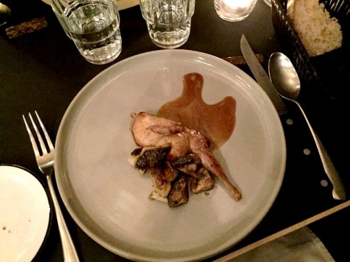 On poursuit avec, en « plats de consistance », le maigre, chou rouge, kale et saké (plus classique), et la caille, chou fleur et câpres.