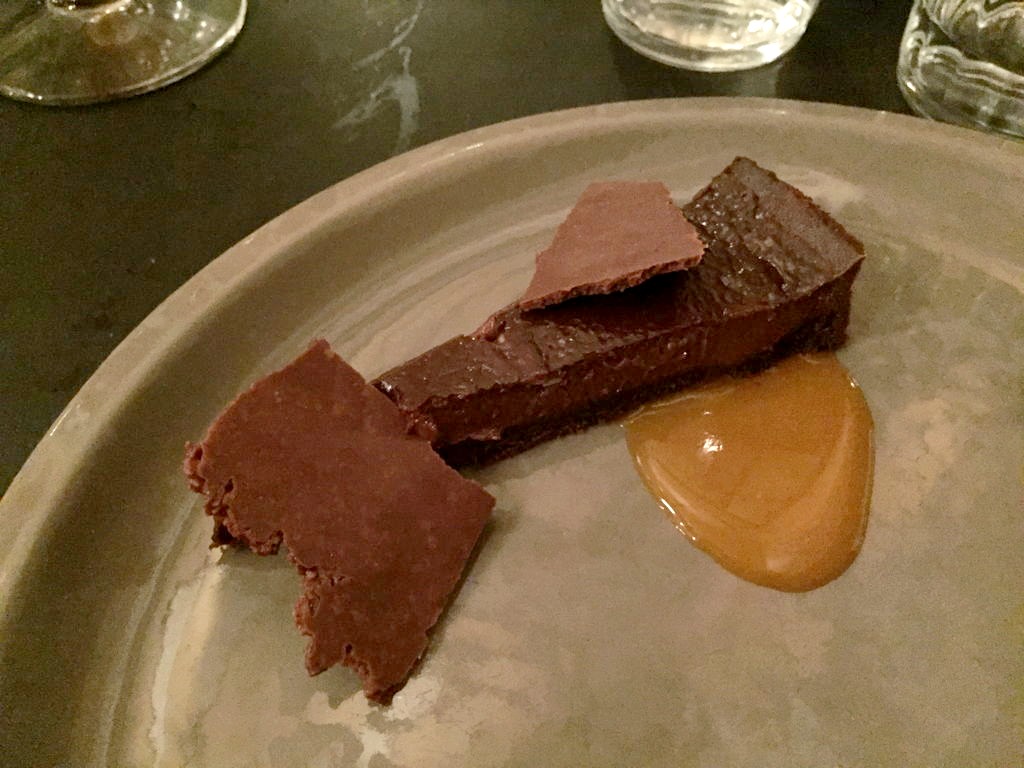 On termine par une note plus sucrée, avec la tarte au chocolat noir, praliné noisette et argousier.