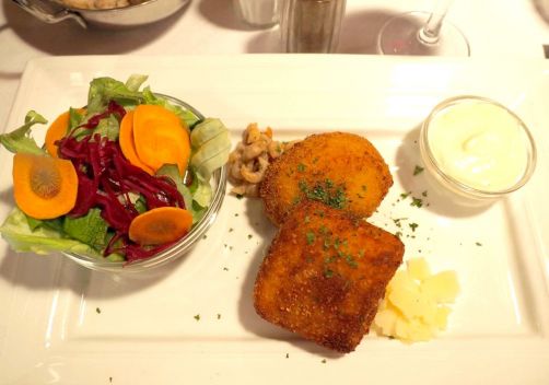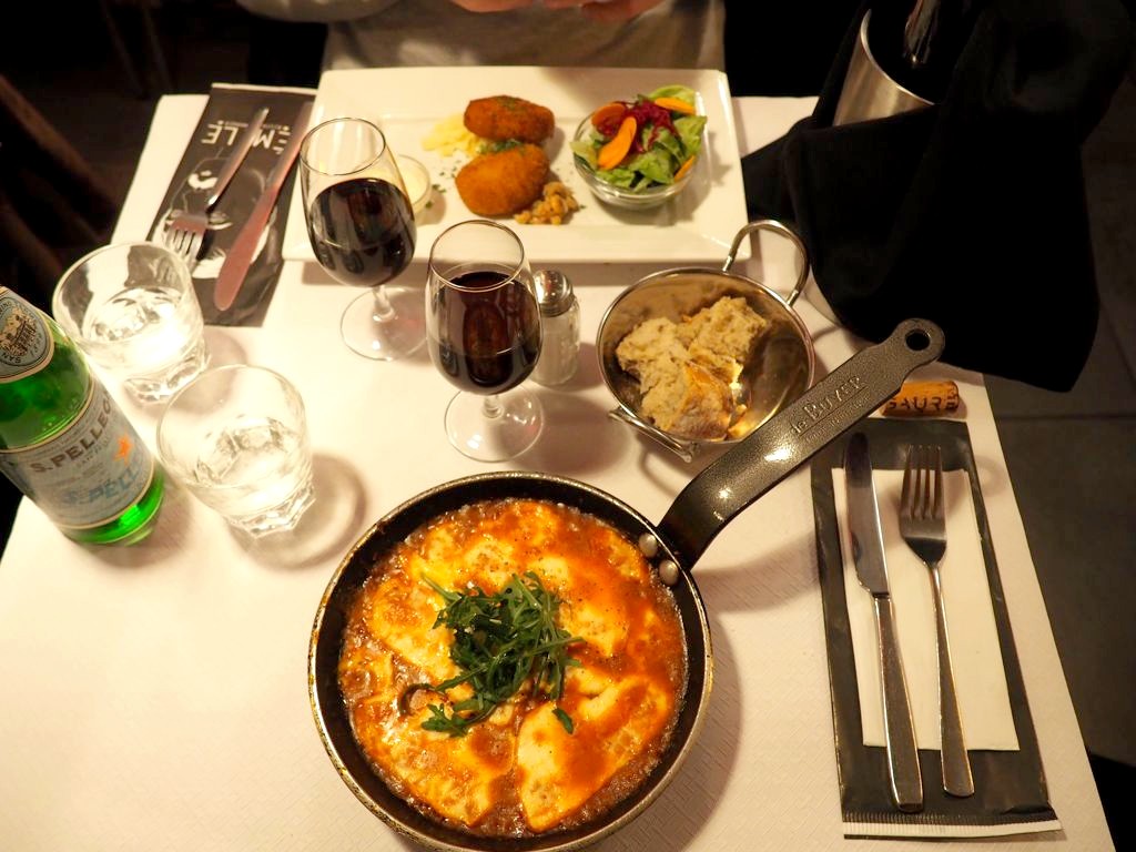 En entrée, nous nous sommes laissés tenter par deux classiques de chez Emile: la poêlée scarmoza (copieuse et délicieuse !) et un mix de croquettes aux crevettes et au fromage. Accompagné de très bon pain.