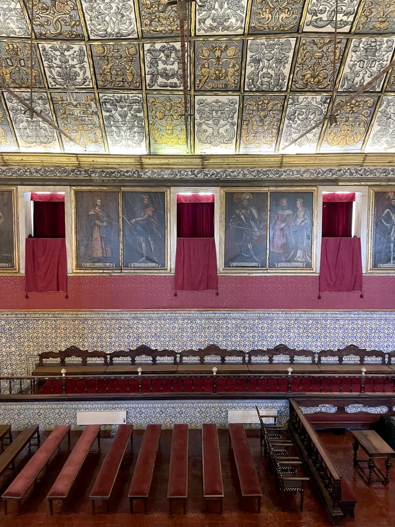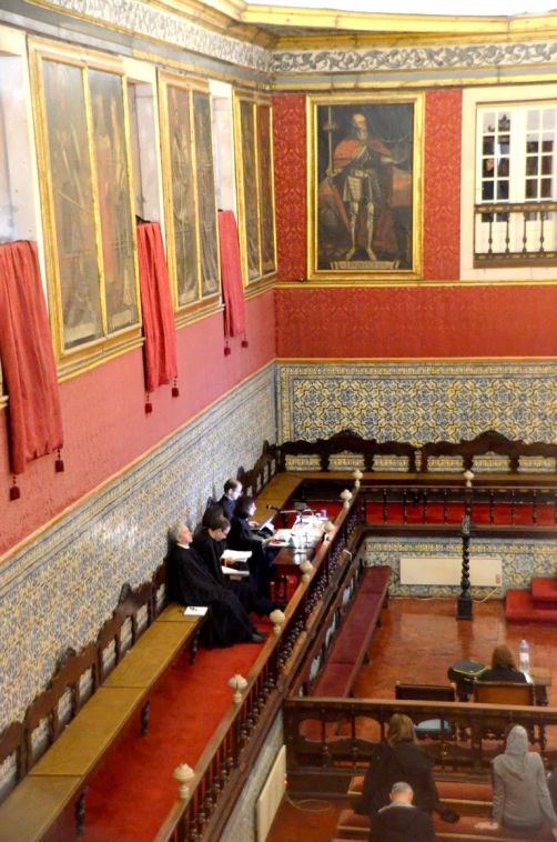 Nous finissons la visite par la Sala dos Capelos (la salle des actes), et – chance ! – nous avons l’occasion d’observer l’une des soutenances de thèses, qui se déroulent traditionnellement dans cette grande salle couverte des portraits des rois portugais.