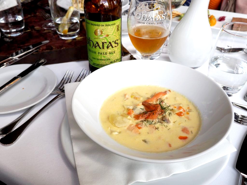 L’intérieur du château est un mariage de style assez éclectique (que personnellement j’aime beaucoup), chaque salon et pièce ayant une atmosphère bien particulière. Nous avons mangé dans l’une des salles du restaurant avec vue sur les jardins du château. Le chef Graham Gallagher y propose une cuisine de saison typiquement irlandaise, utilisant notamment les herbes et légumes de leurs propres jardins !