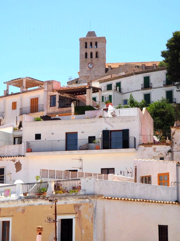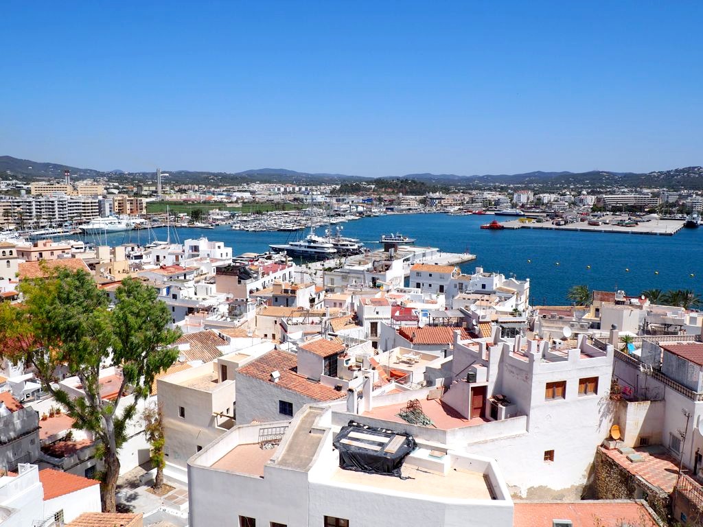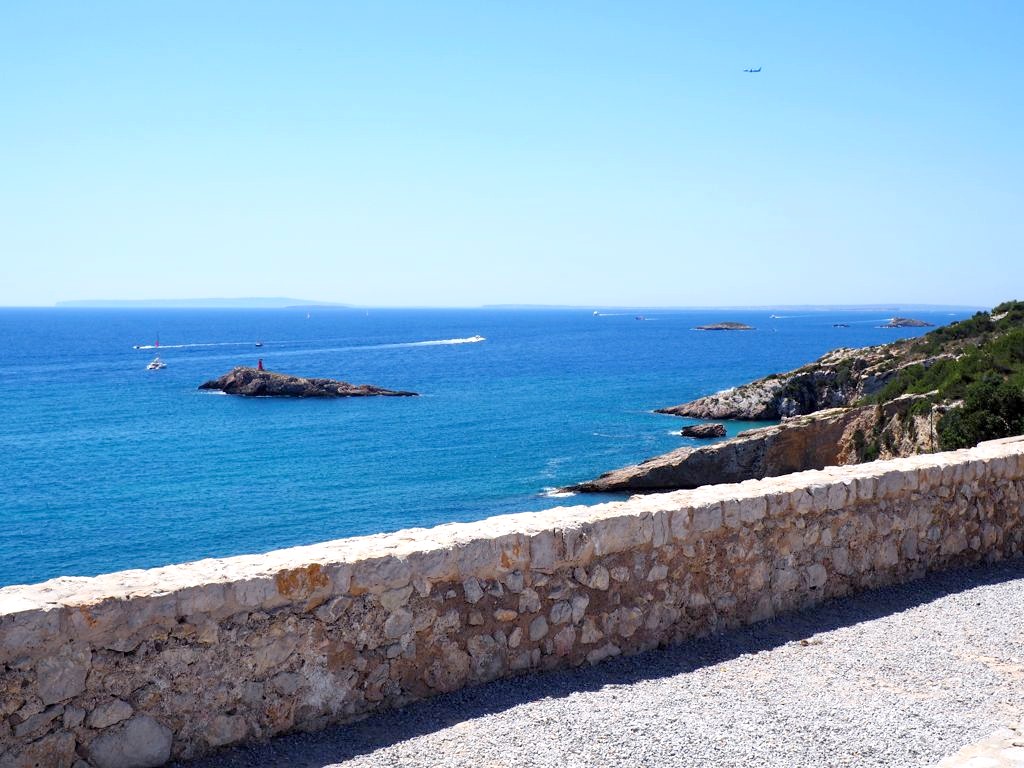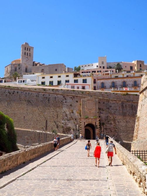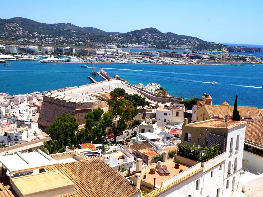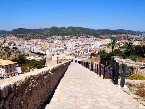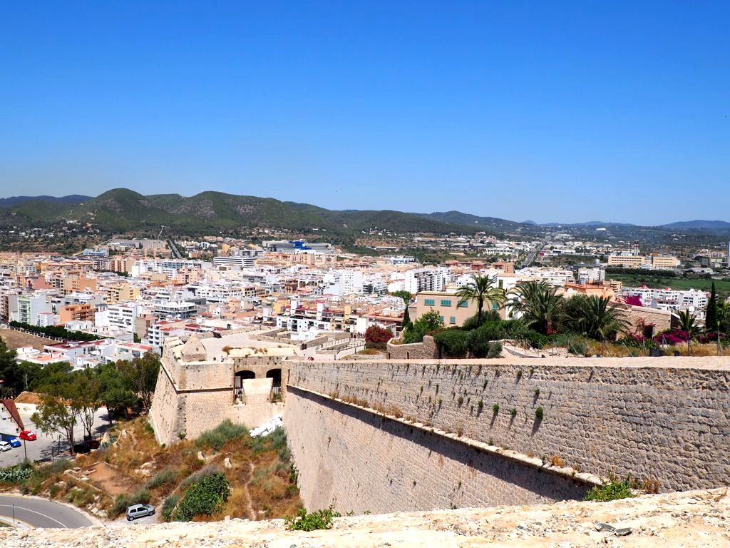 Depuis la plage de notre hôtel (le Hard Rock Hotel Ibiza), nous apercevions déjà la citadelle, tout au bout de la baie. En s’approchant de la ville, elle est de plus en plus impressionnante, perchée très haut face à une mer d’un bleu intense.