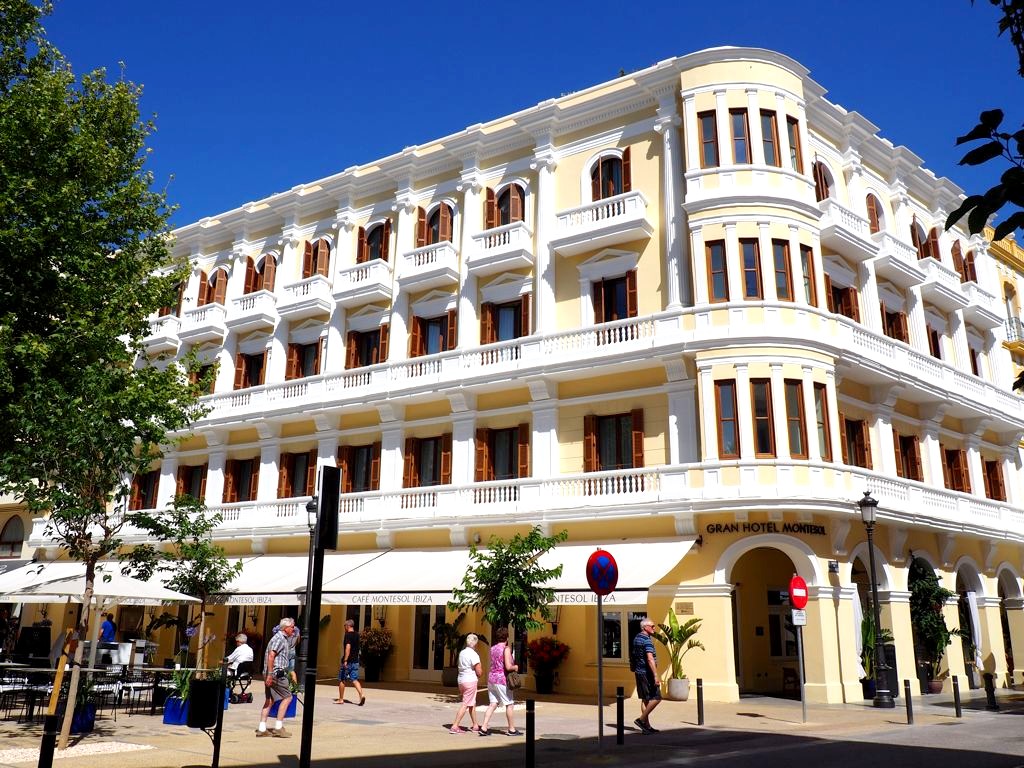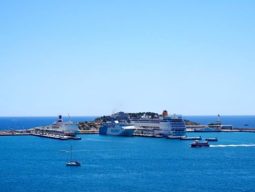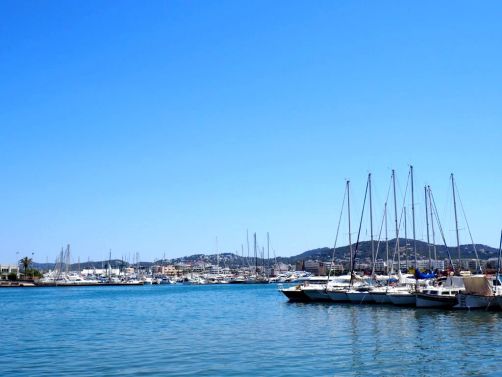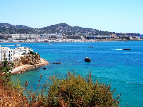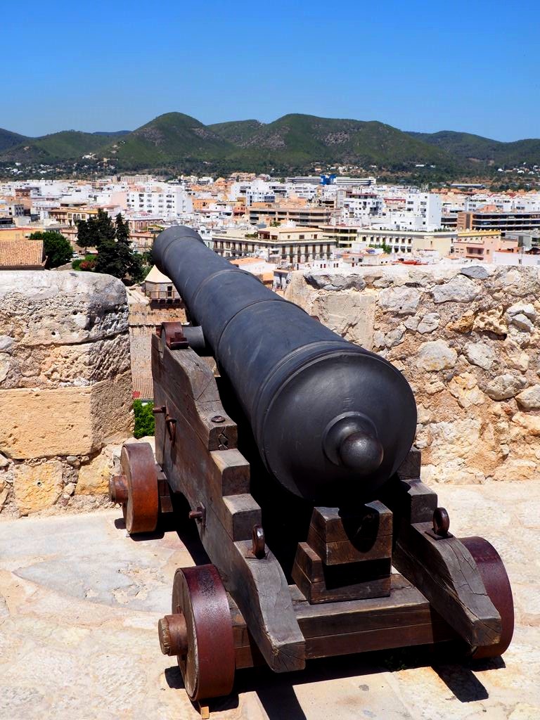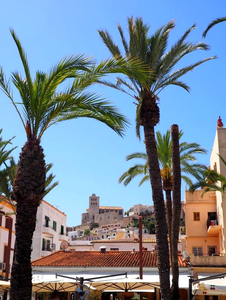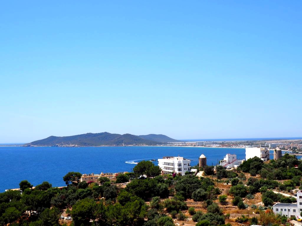 Depuis la plage de notre hôtel (le Hard Rock Hotel Ibiza), nous apercevions déjà la citadelle, tout au bout de la baie. En s’approchant de la ville, elle est de plus en plus impressionnante, perchée très haut face à une mer d’un bleu intense.