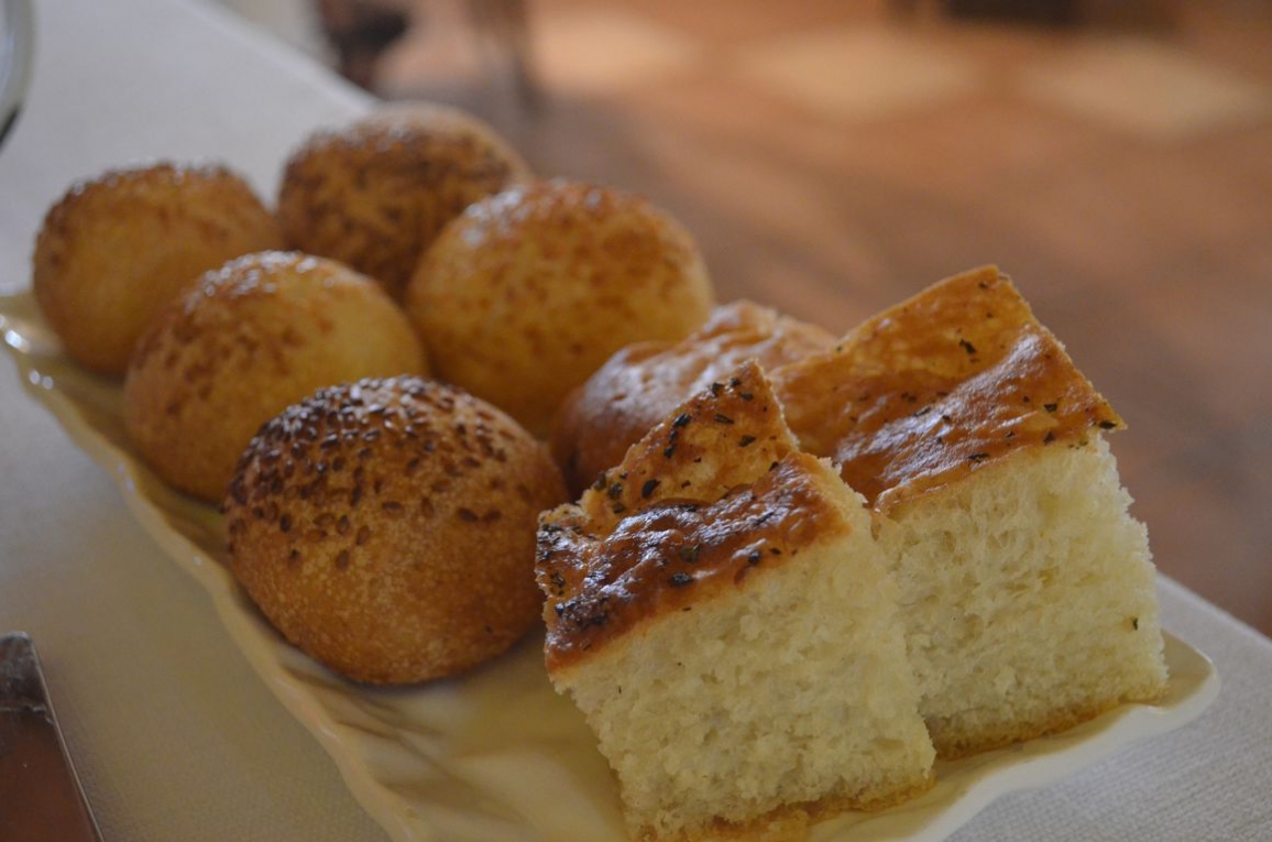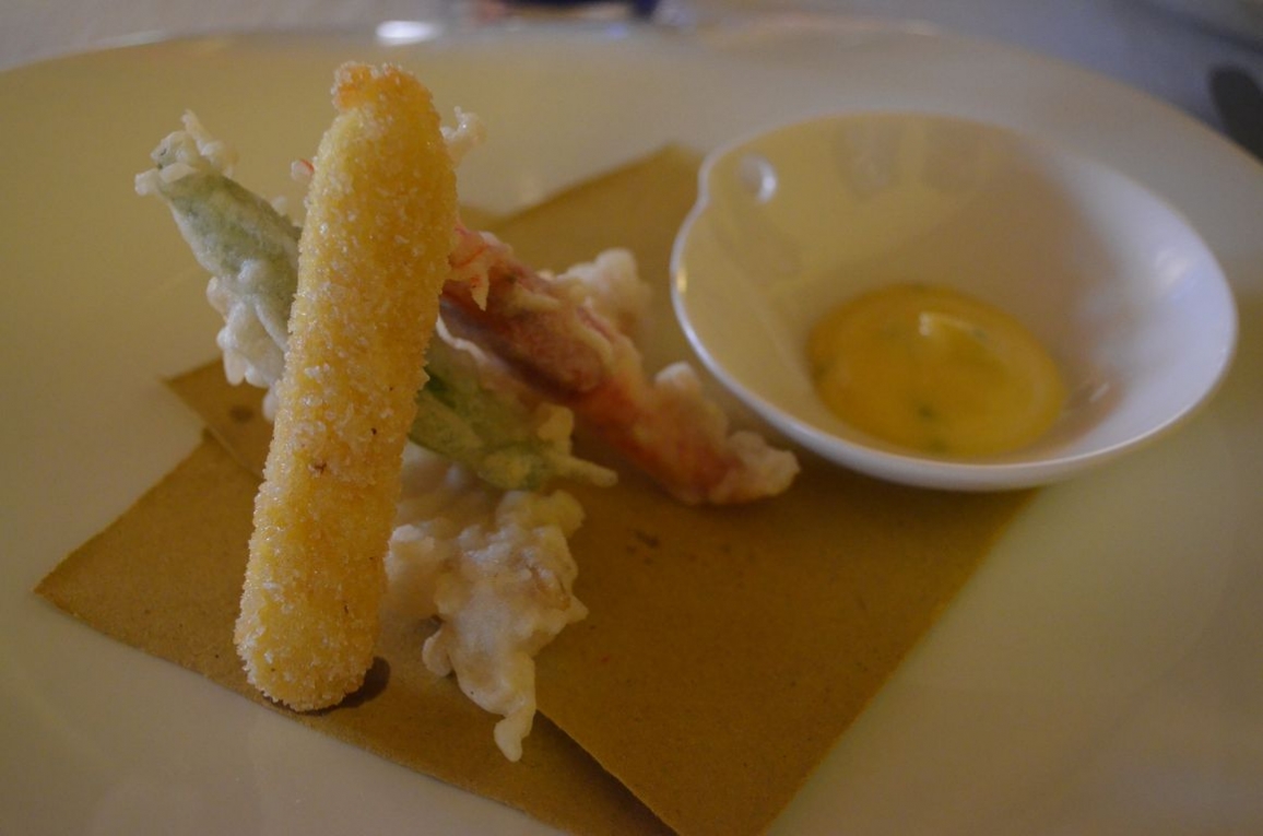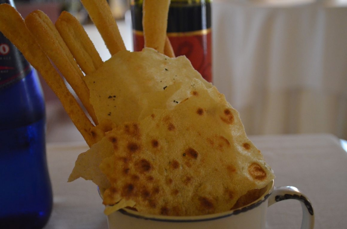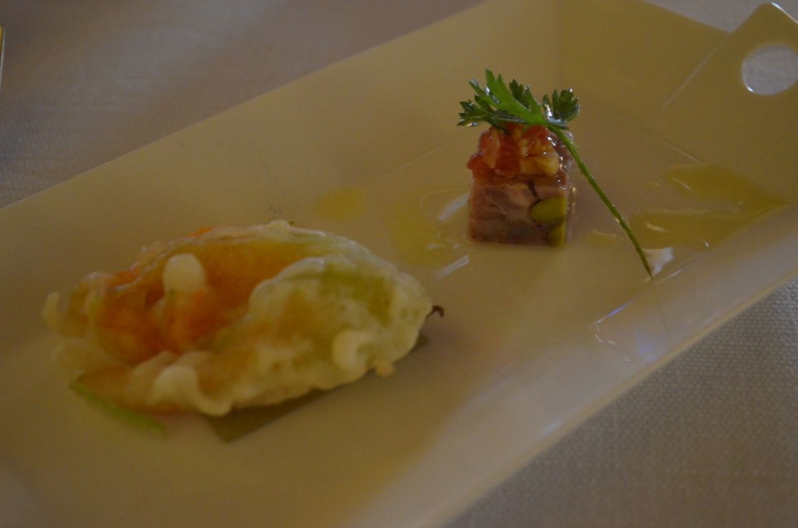 La dégustation apéritive est la même pour les deux menus: il s’agit d’une fleur de courgette (du potager) accompagnée d’une petite terrine de porc. Sur la table, nous recevons également un assortiment de pains sardes, tous faits maison.