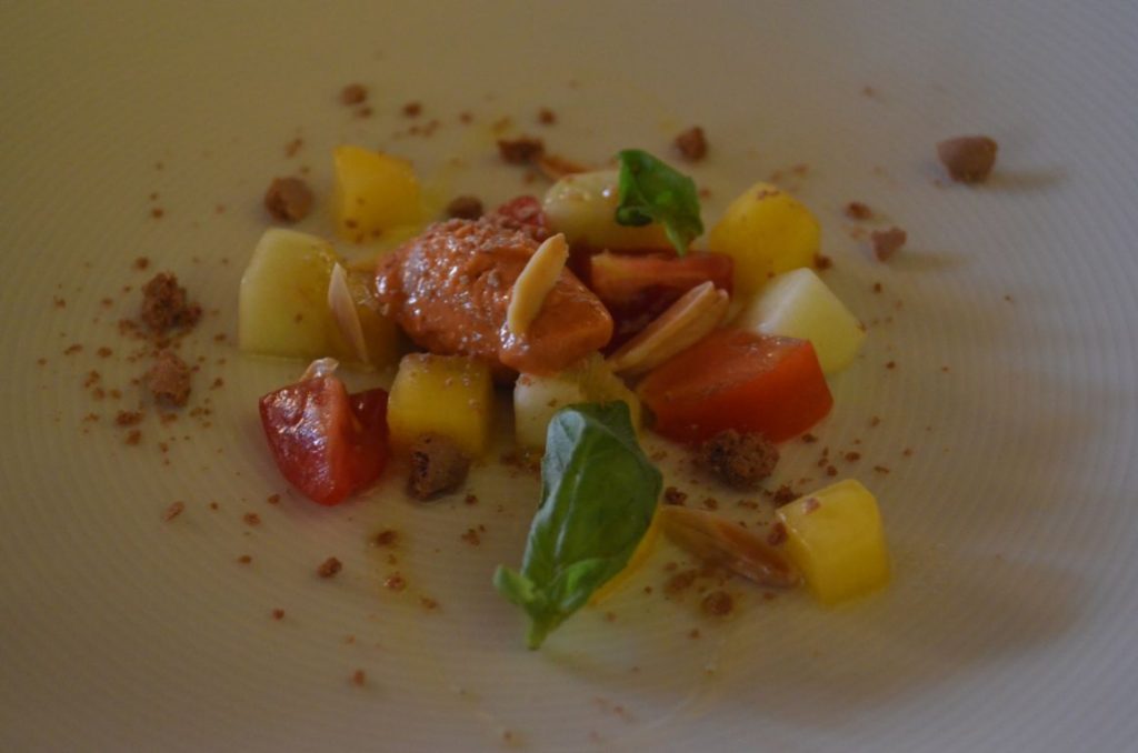 Salade aux pêches et aux tomates avec une glace de crevettes roses, amandes grillées et biscuit au chocolat