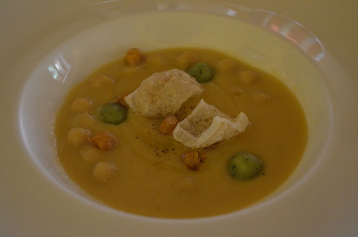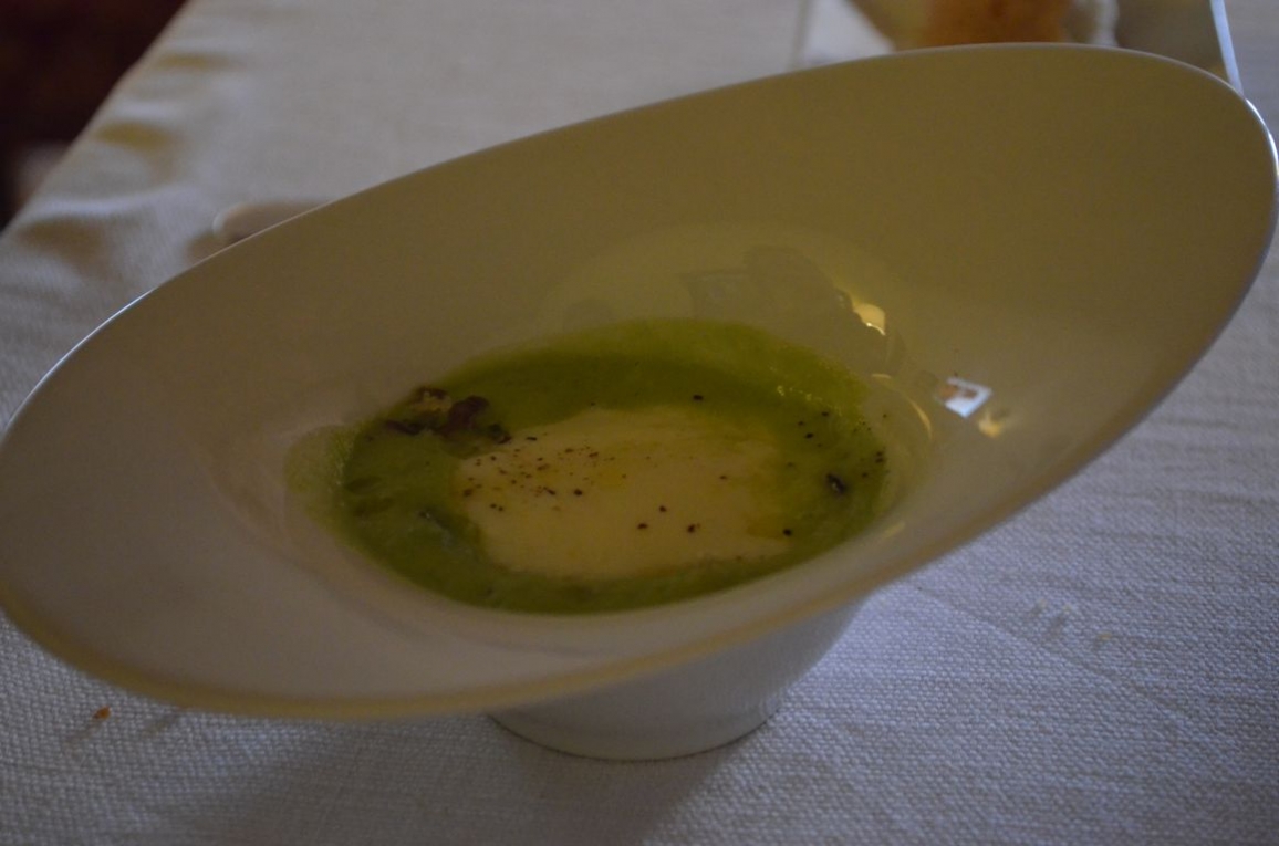 Soupe aux pois, pois croquants, gnocchis de fromage aux herbes et aux cèpes