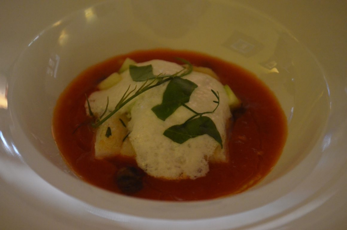 « guazzetto » (soupe) aux tomates amères, filet de vive, légumes, câpres et « casu axedu » (fromage amer)