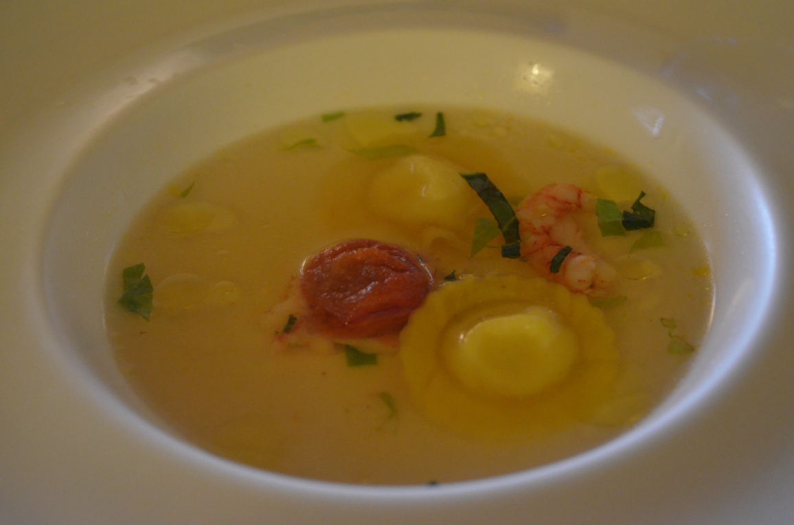 Bouillon de poule aux herbes, crevettes crues et « casu axedu »
