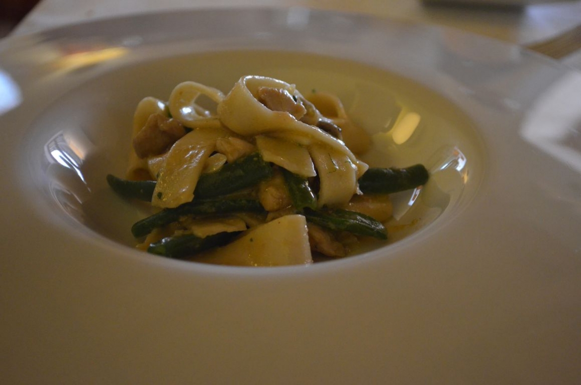 « pillus de semola » (pâtes) faites maison, maquereau cru, haricots verts au gingembre