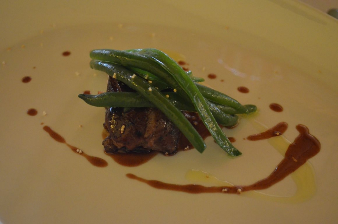 Porc cuit à basse température avec une sauce aux cerises, haricots verts et romarin.
