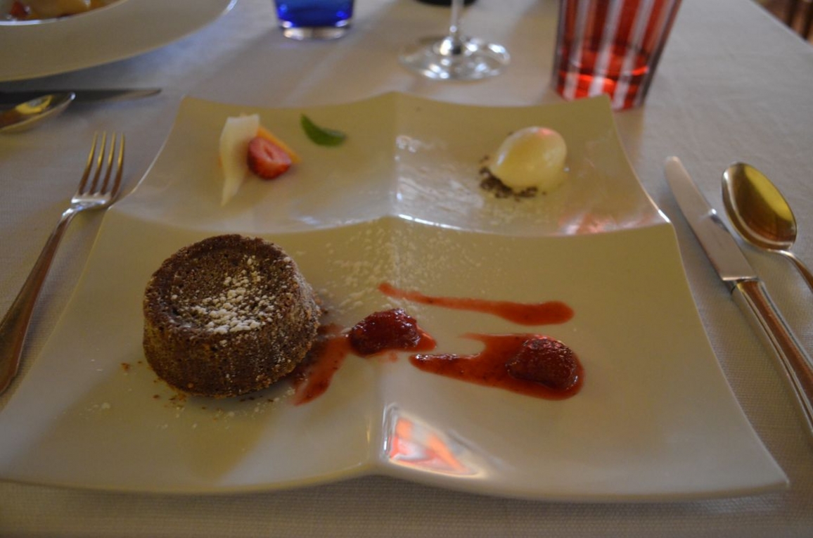 Le cadre du S’Apposentu se marie à merveille avec les plats que l’on y mange: c’est également un mélange de traditions (avec ses tapisseries sardes au mur) et de modernité (avec ses oeuvres contemporaires, ses verres colorés,…). Le chef et son équipe nous accueillent de manière très chaleureuse, et nous offrent même un petit apéritif. Nous nous décidons assez rapidement pour les menus dégustations. Fred dégustera le menu mer, quant à moi ce sera le menu terre. Les petites assiettes de dégustations s’enchaînent, certaines vraiment surprenantes (surtout pour le menu mer), et nous finissons par un dessert que nous pouvons choisir à la carte.