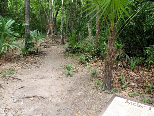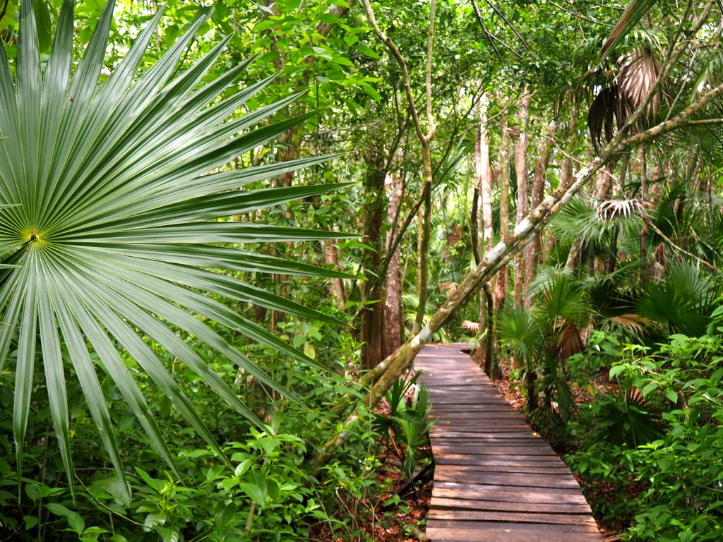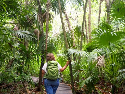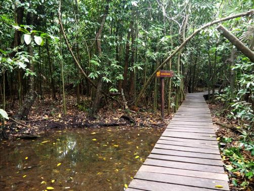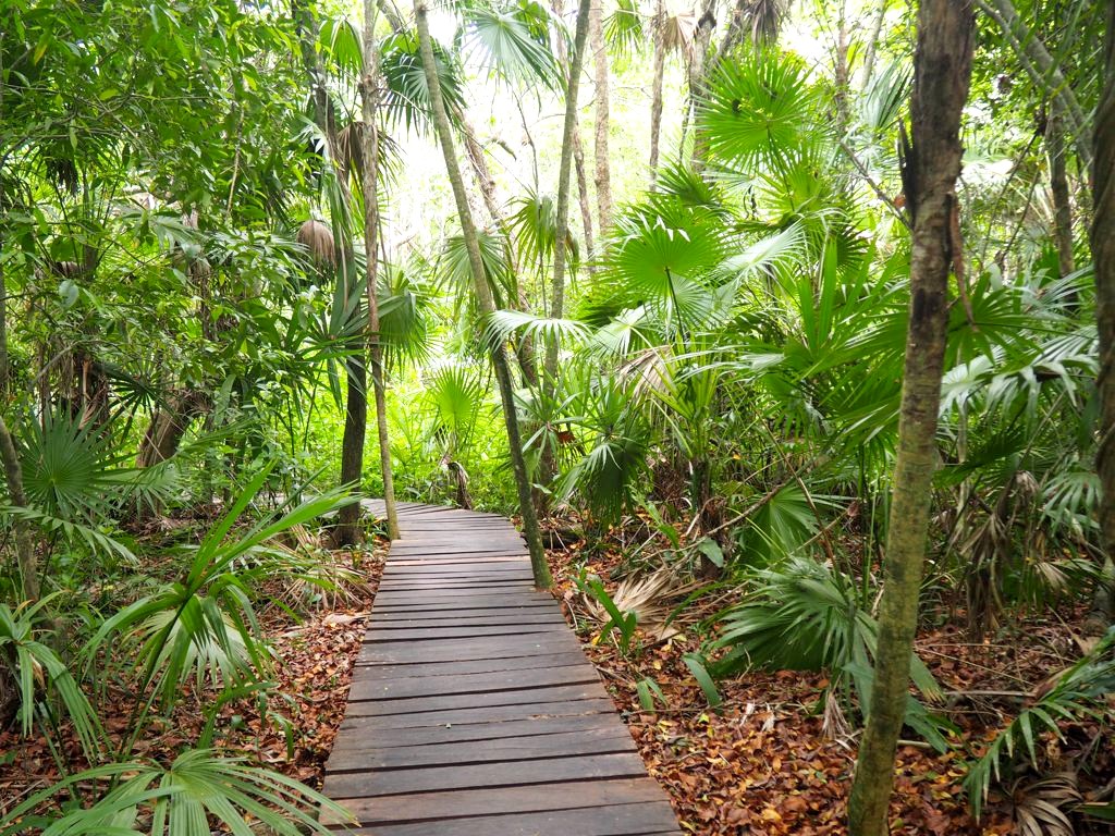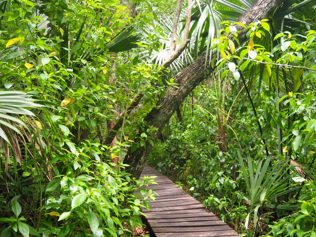 Une fois que vous avez fini de visiter le site archéologique, empruntez l’ancien chemin maya (sacbe) marqué d’un panneau et situé juste derrière le temple « Castillo ». A la fin de ce chemin (dont il ne reste plus grand chose), vous arrivez à un petit guichet qui marque l’entrée du « Nature Boardwalk », une balade dans la jungle sur un sentier en bois (mais quand on est rentré après le bateau, plus personne n’en contrôlait l’entrée donc avec un peu de chance…).