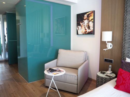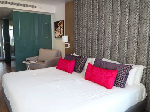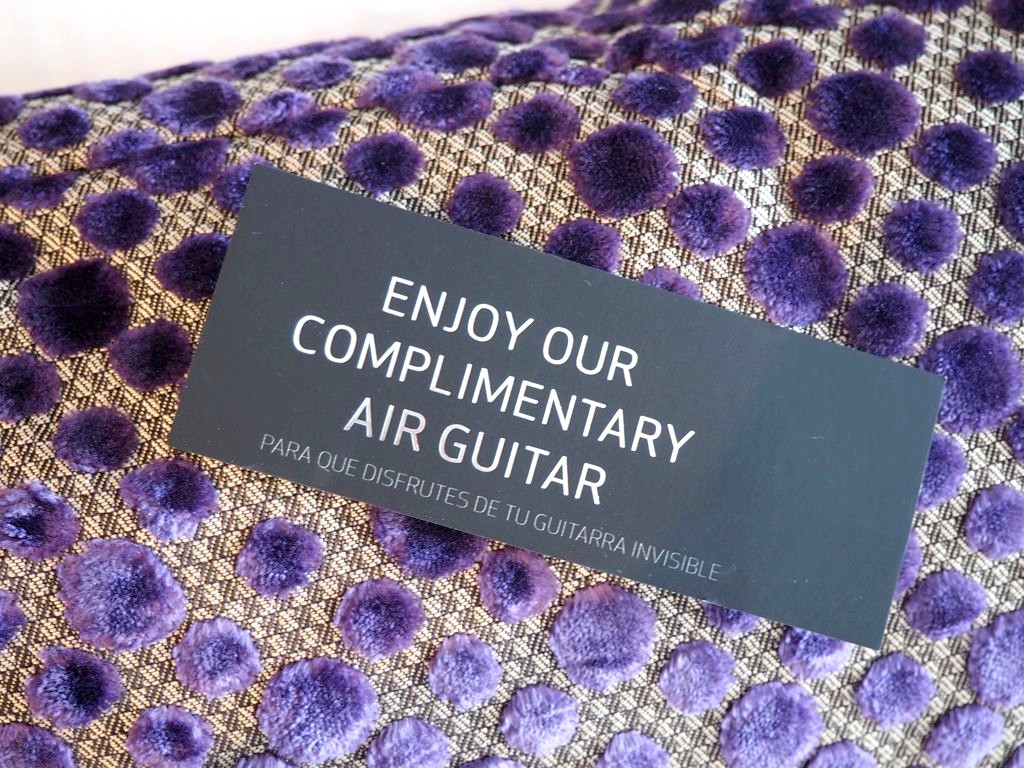 En ce qui concerne la chambre, j’ai été ravie : belle vue sur mer, grand lit, énorme douche à l’italienne, terrasse, et même… une « air guitar » – ils ont de l’humour au Hard Rock !