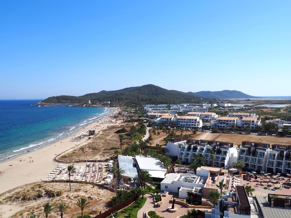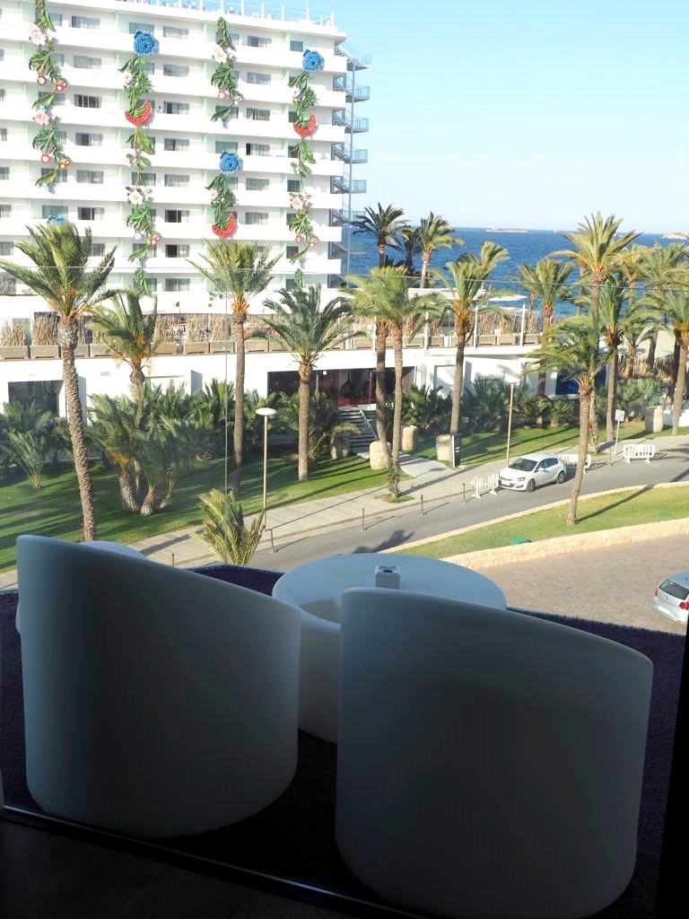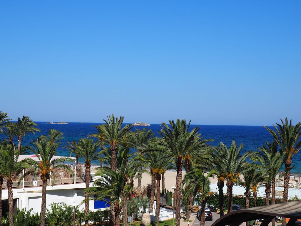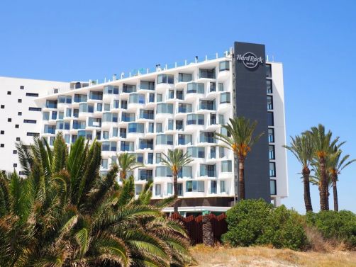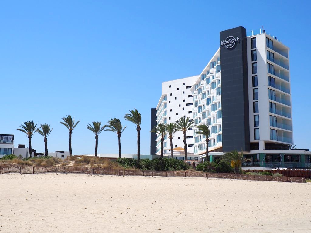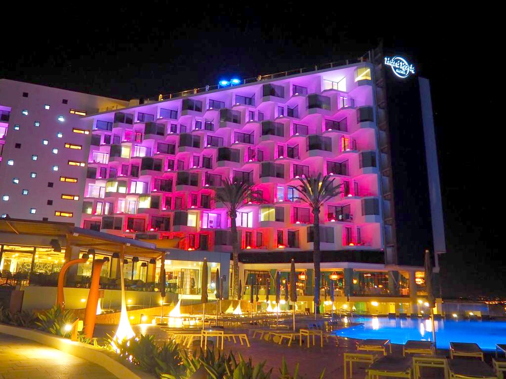 Comme je m’y attendais, l’hôtel était énorme ! A côté du bâtiment principal, il y avait plusieurs plus petis « blocs » d’appartement, la plupart avec vue sur mer bien entendu. Car le Hard Rock Hotel Ibiza se situe face à la plage de Platja d’en Bossa, une longue plage populaire à quelques kilomètres de la vieille ville d’Ibiza. C’est une zone hôtelière très animée, avec quelques clubs très connus, comme le Ushuaïa juste à côté, où on a donc passé une soirée.