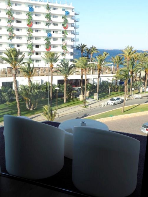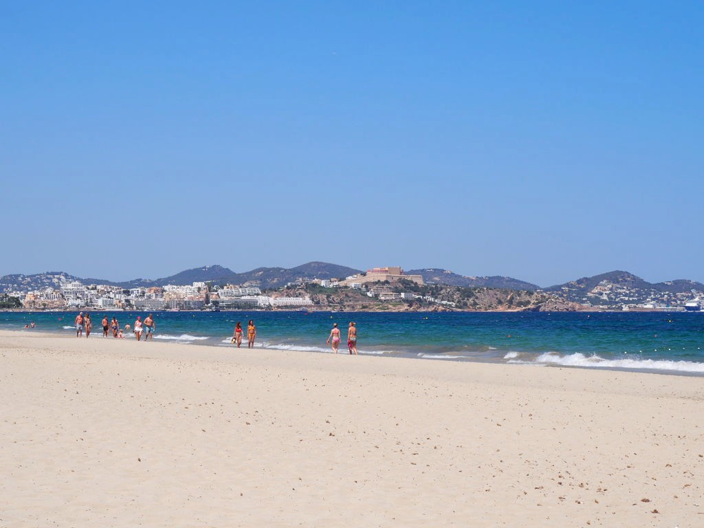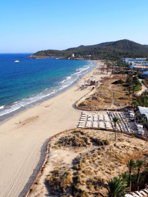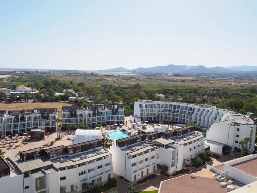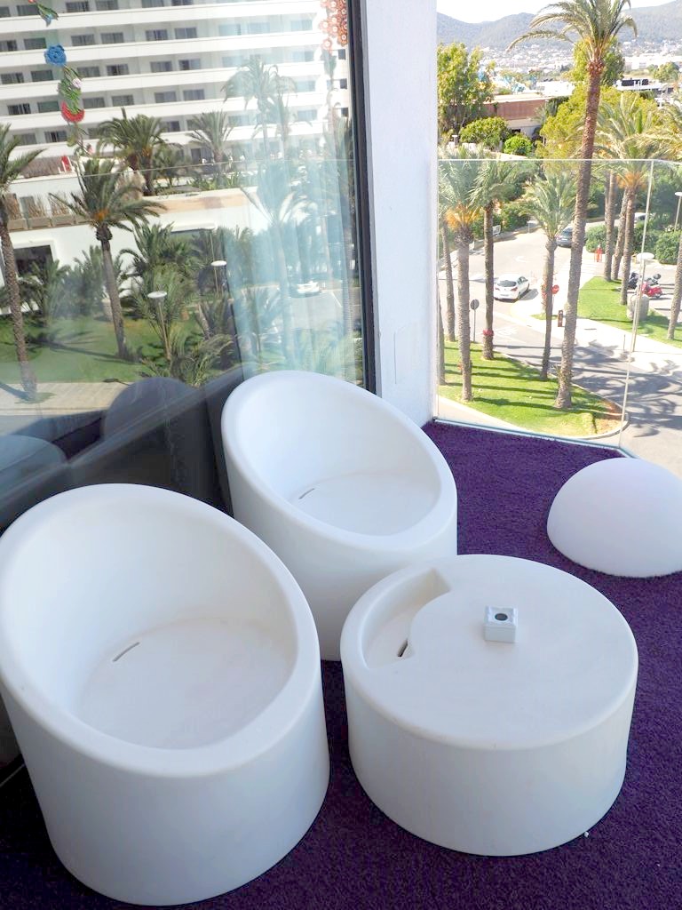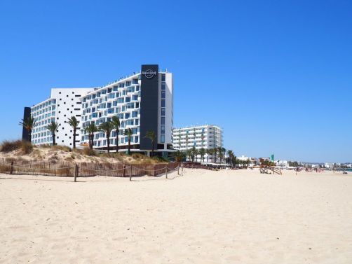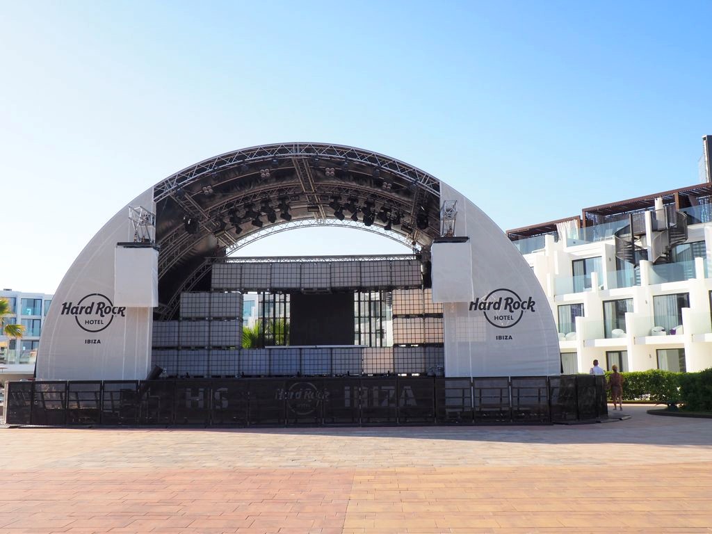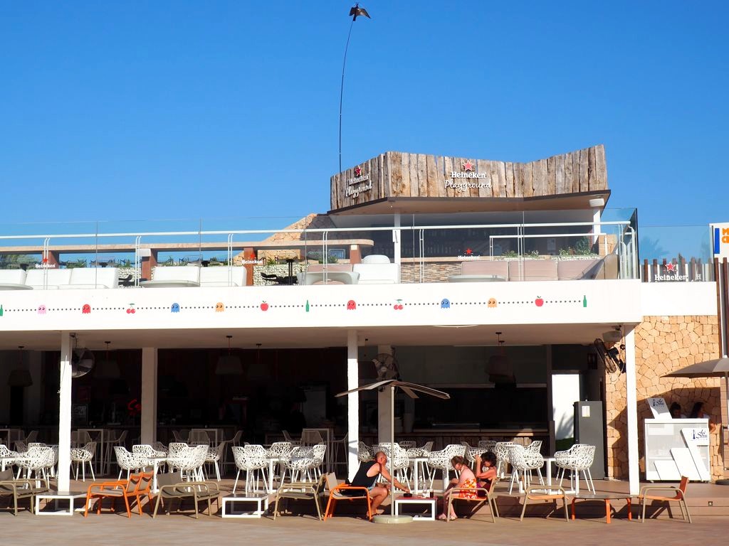 Comme je m’y attendais, l’hôtel était énorme ! A côté du bâtiment principal, il y avait plusieurs plus petis « blocs » d’appartement, la plupart avec vue sur mer bien entendu. Car le Hard Rock Hotel Ibiza se situe face à la plage de Platja d’en Bossa, une longue plage populaire à quelques kilomètres de la vieille ville d’Ibiza. C’est une zone hôtelière très animée, avec quelques clubs très connus, comme le Ushuaïa juste à côté, où on a donc passé une soirée.
