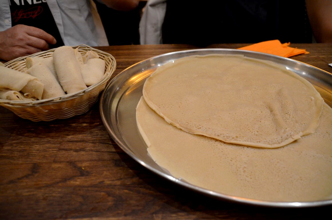 Le principe est simple : on choisit un menu ou à la carte, on reçoit sur une grande crêpe ses petites préparations (options végétariennes des deux côtés), et on déguste en attrapant sa nourriture avec un morceau de crêpe. C’est donc assez consistant, et avec les crêpes, on est vite rassasiés. La plupart des petits plats sont en sauce, avec souvent des viandes mijotées. Le tout est assez relevé, mais il y a différents degrés de piquant en fonction de ce qu’on choisit.