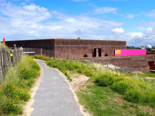 La manière la plus sympa de rejoindre le Fort Napoléon est de rejoindre la grande digue en bordure de sable (et sans constructions !) qui permet même pour ceux qui veulent d’aller jusqu’à Bredene. Je ne connaissais pas du tout ce coin et j’ai trouvé la balade assez dépaysante !