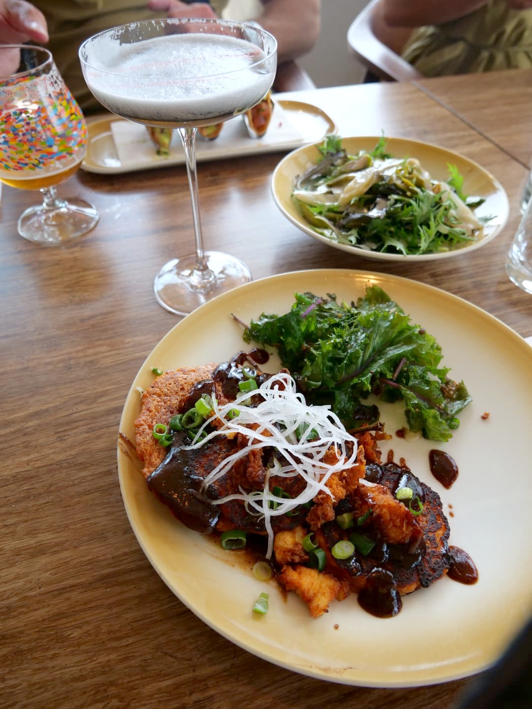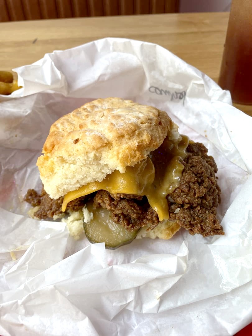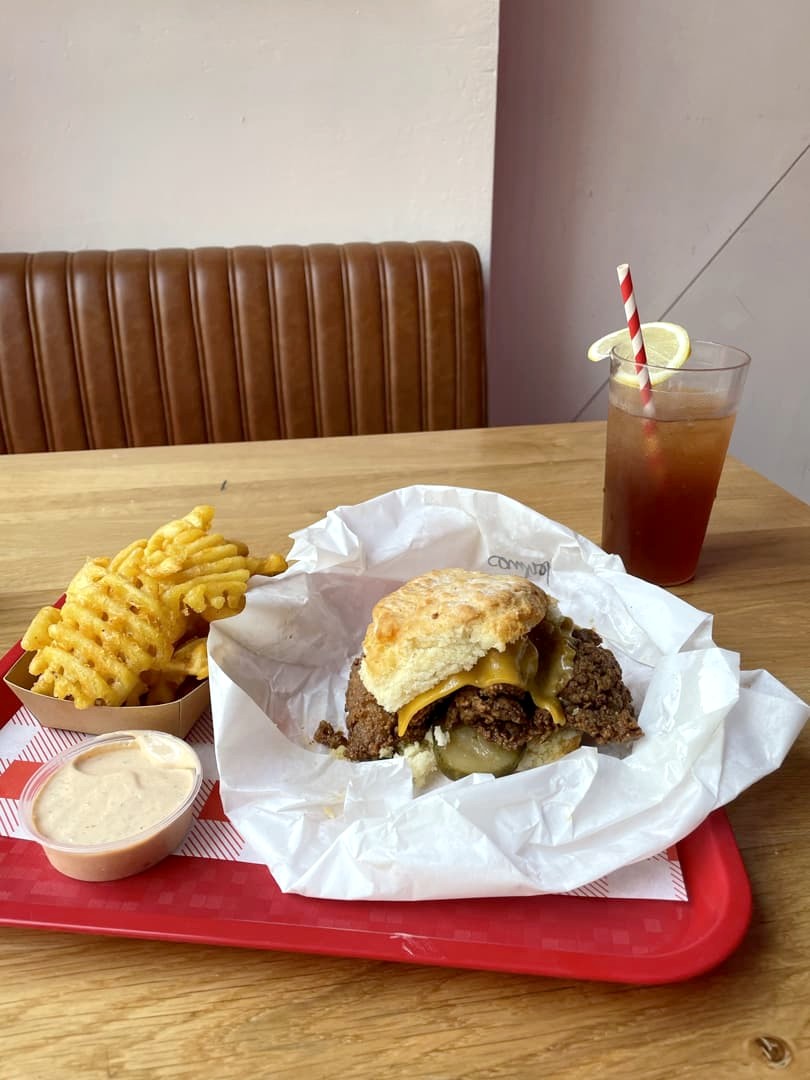 Honnêtement, je pense que les quelques mauvais avis que j’avais pu lire sont par des gens qui n’ont jamais été aux Etats-Unis : car ça goûte vraiment comme là-bas ! Ultra gras certes, mais ultra gourmand : à faire si vous êtes en manque de véritable soul food. Pour goûter aux deux spécialités de la maison, j’ai opté pour le biscuit en version burger, avec du fried chicken et des épices façon Nashville : bien épicé, et décadent à souhait. À accompagner par un sweet tea, tant qu’à faire, puisqu’après ça vous êtes déjà foutu niveau calories pour la journée !