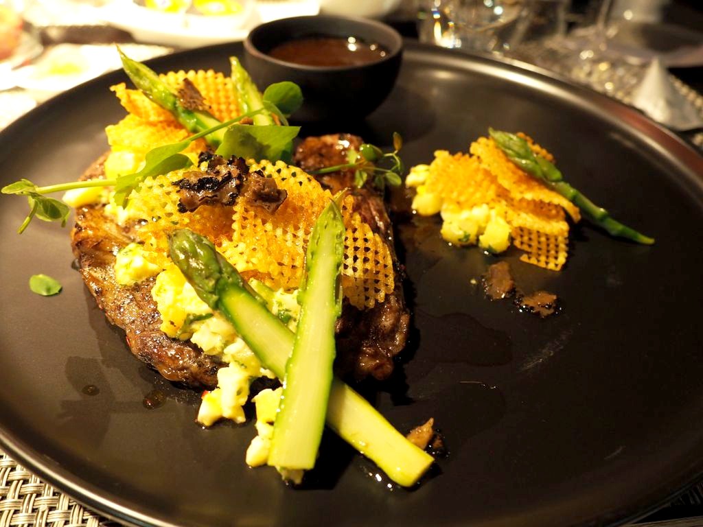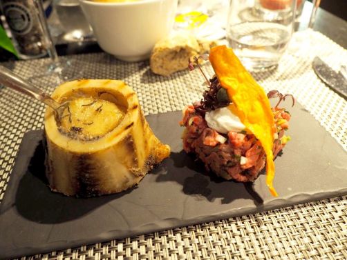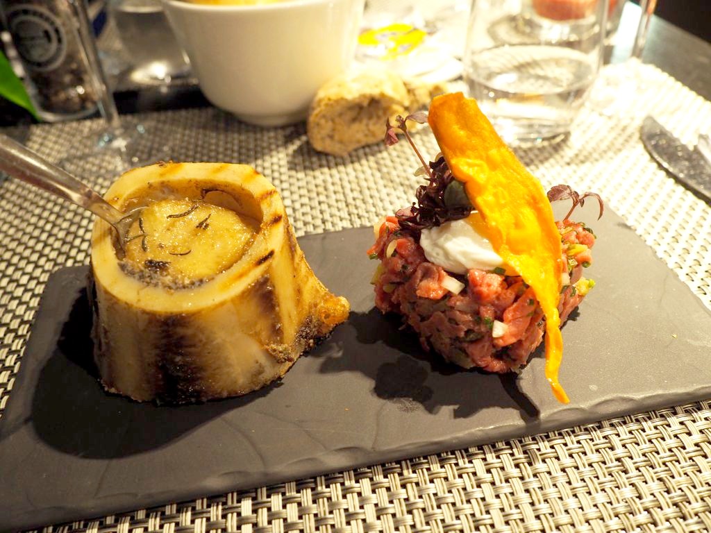 Parmi les plats que j’ai pu goûter, je vous recommande en particulier le tartare de boeuf, moelle grillée et oeuf de caille poché en entrée, les bonbons de volaille, sardines grillées, lomo Pata Negra (une belle association !) et beurre blanc de rosé, et enfin en dessert la cigarette russe, ganache pop-corn et abricots rôtis !
