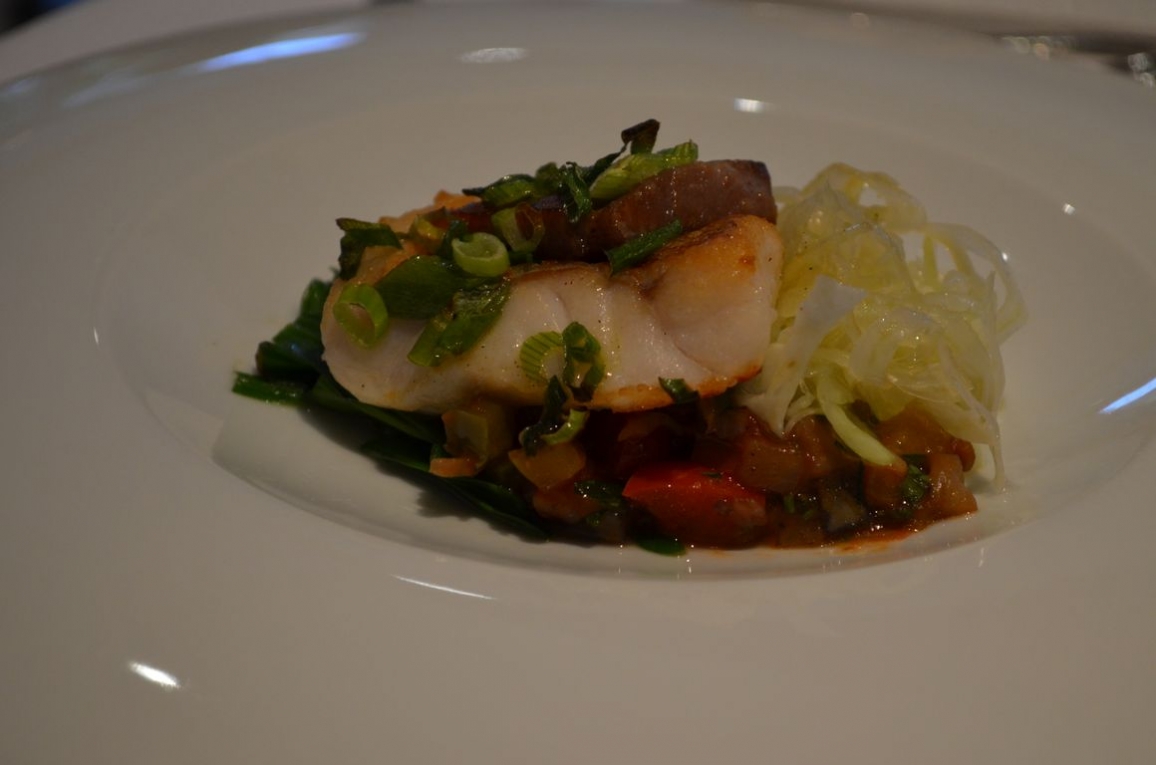 Entrée: rouget et lard basque aux jeunes oignons, fenouil et aubergines