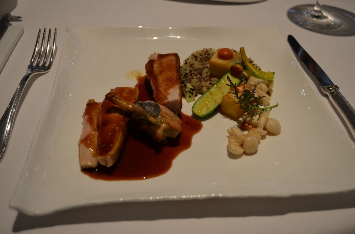 Plat: pintade fermière au quinoa noir, fleur de courgette et romesco
