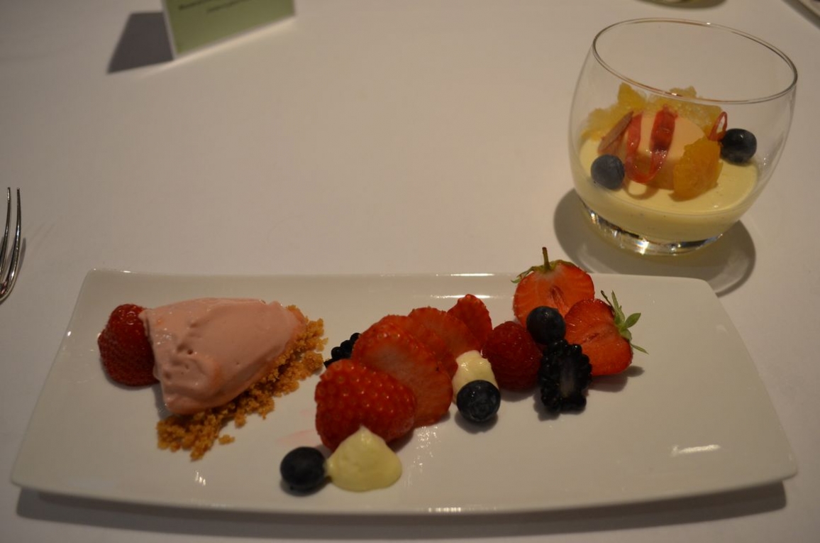 Dessert: mousse au fromage blanc de Beersel et verveine (ça, c’était TOP!), fraises et glace rhubarbe