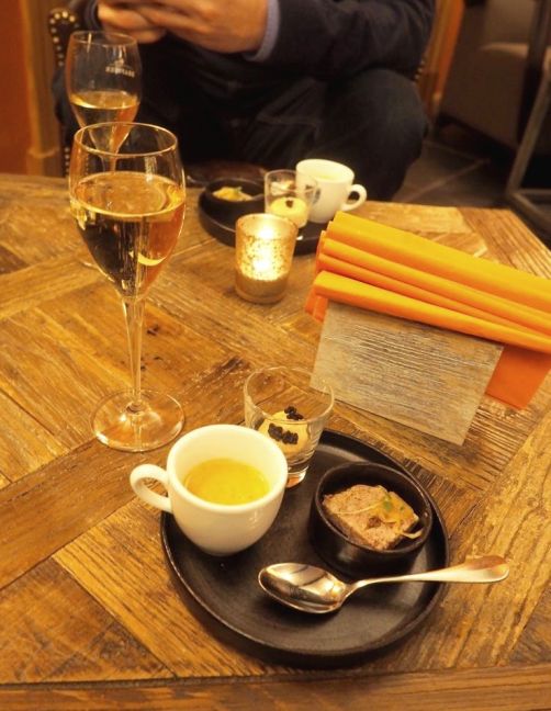 C’est donc déjà bien relaxés que nous avons commencé notre soirée à la Barrière de Transinne avec un petit apéritif au bar de l’hôtel, près du feu. J’ai adoré son ambiance cosy, vraiment parfaite en hiver ! Après avoir dégusté quelques mises en bouche au bar, nous sommes passés dans la salle de restaurant pour commencer notre repas gastronomique.