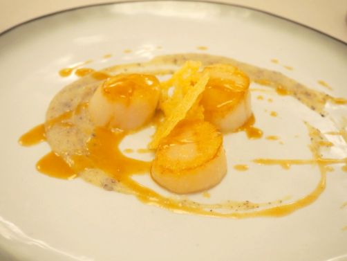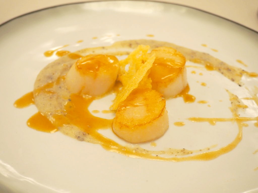 Nous continuons avec les Saint-Jacques rôties (parfaitement cuites !) accompagnées d’une purée de topinambours à la truffe et tuile de parmesan.