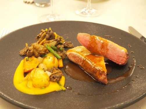 Enfin, en plat de consistance, voici le magret de canette en basse température, butternut et fricassée de légumes de saison. À nouveau une viande tendre et des accompagnements riches en goût.