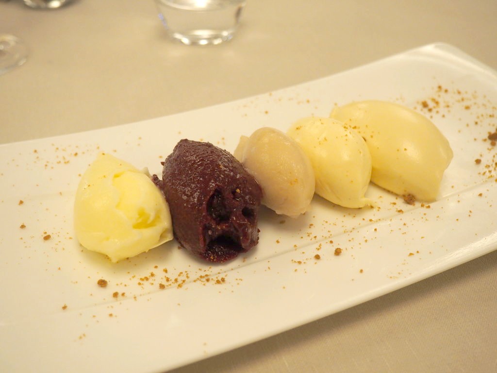 Le dessert était parfaitement ce qu’il nous fallait après ce festin : la palette de glaces et sorbets de saison tournés minute nous a permis de terminer par une note fraîche très agréable.