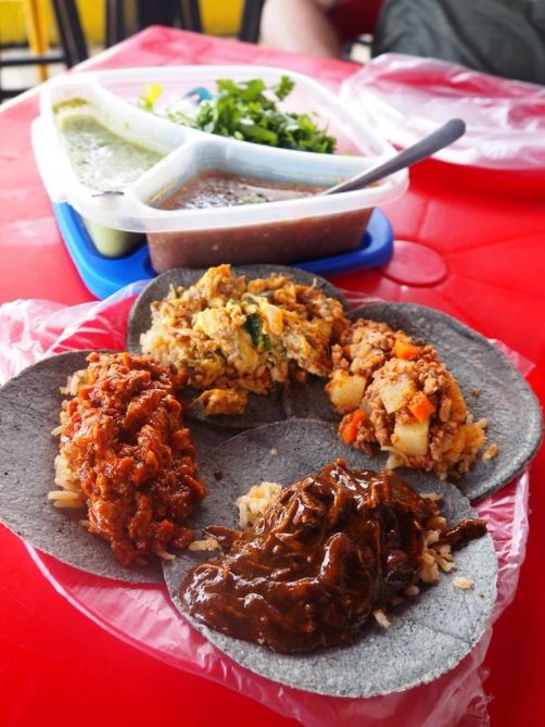 - panochus: tortillas frites fourrées aux haricots noirs et recouvertes de poulet/dinde, avocat, salade, oignon mariné
